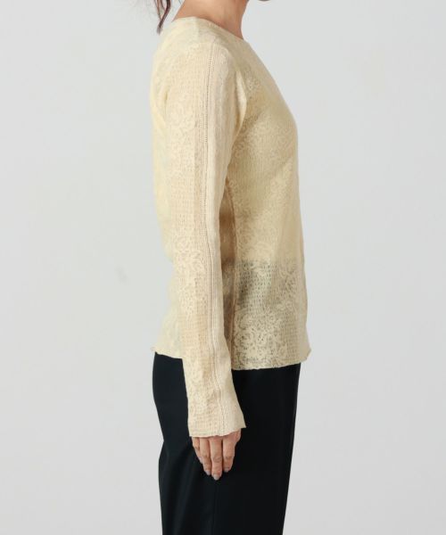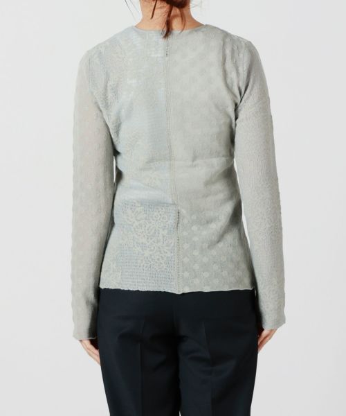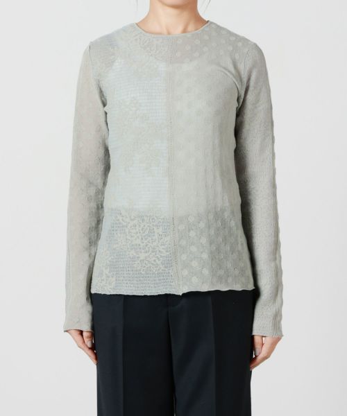 【デザイン】さらりとしたタッチのリネンブレンドヤーンとハリのあるクリアヤーンを使用しています。 ヴィンテージライクなレース柄とドット柄をパネル状に組み合わせた編み柄が特徴。 程よいシアー感と少し長めの丈で合わせるアイテムを選ばずに着回せるプルオーバーです。