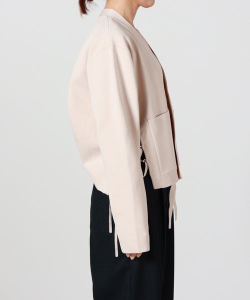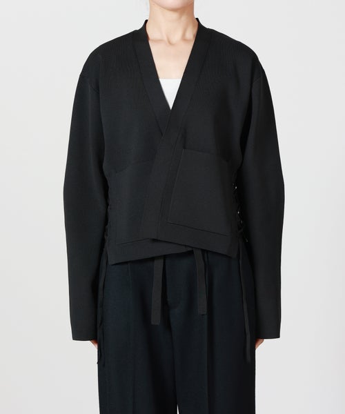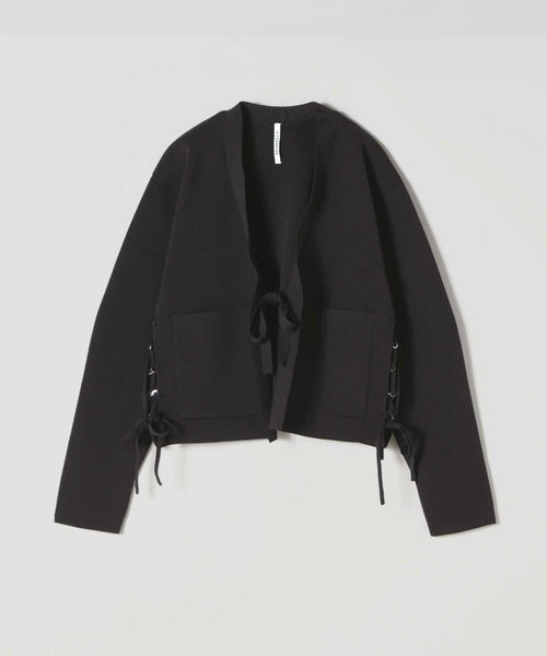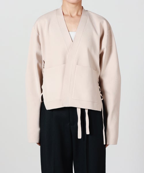 【デザイン】A CCORDION(アコーディオン)のカーディガン。構築的でありながら軽やかさを感じさせる、モダンなデザインが魅力の一着です。前振りに設計された両脇は、RINGに通して調整するレースアップ仕様。結び方や締め具合によってシルエットに変化をつけられ、着る人の体型やスタイリングに自然にフィットします。センターフロントには結んで留められるテープを配し、羽織としてもトップス感覚でも着用可能。さっと結ぶだけで立体感が生まれ、シンプルなコーディネートのアクセントになります。実用性を兼ね備えたパッチポケット付きで、デザイン性と日常使いのバランスも◎。全体は身体のラインを拾いすぎず、ほどよくコンパクト。インナーを選ばず、ワンピースやワイドパンツ、デニムなど幅広いアイテムと好相性です。