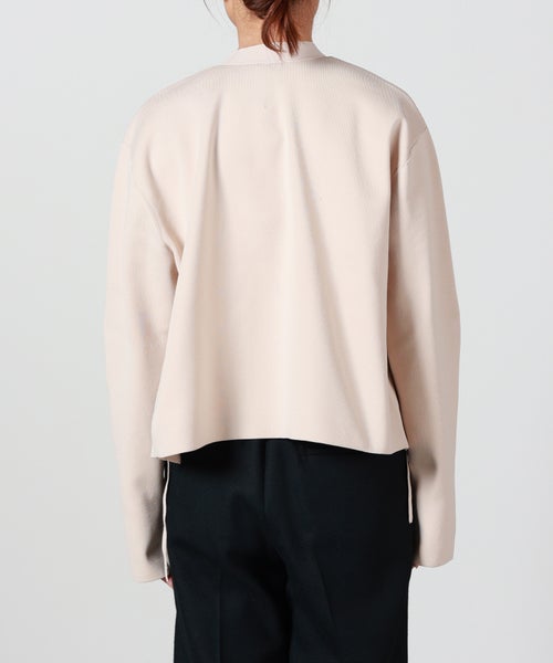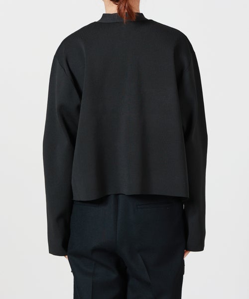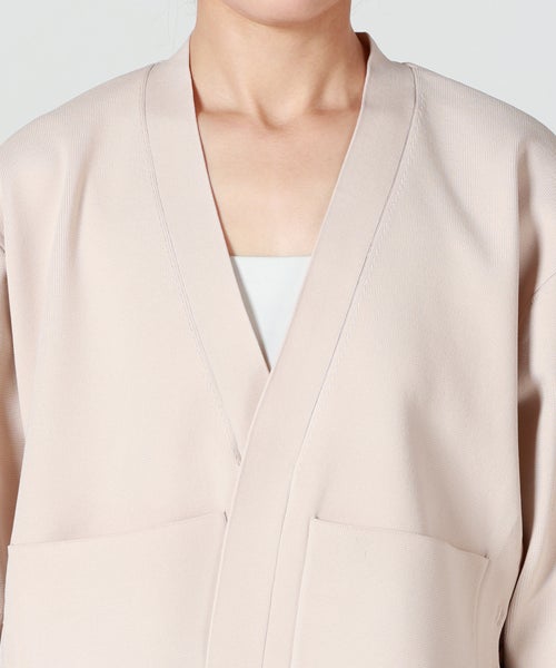 【素材】ポリエステル100%素材を使用。ハリがありながらもストレッチ性に優れた糸を採用しているため、触れるとさらっと軽く、しなやかな弾力を感じられます。着用時は動きに合わせて自然に伸び、長時間着てもストレスを感じにくいのが特徴。 見た目はきちんと感があり、シワになりにくく、形崩れしにくい点も嬉しいポイントです。季節の変わり目には羽織として、寒い時期にはレイヤードアイテムとして活躍。軽量で扱いやすく、日常からきれいめなシーンまで幅広く対応します。