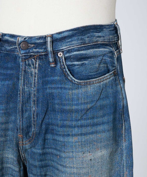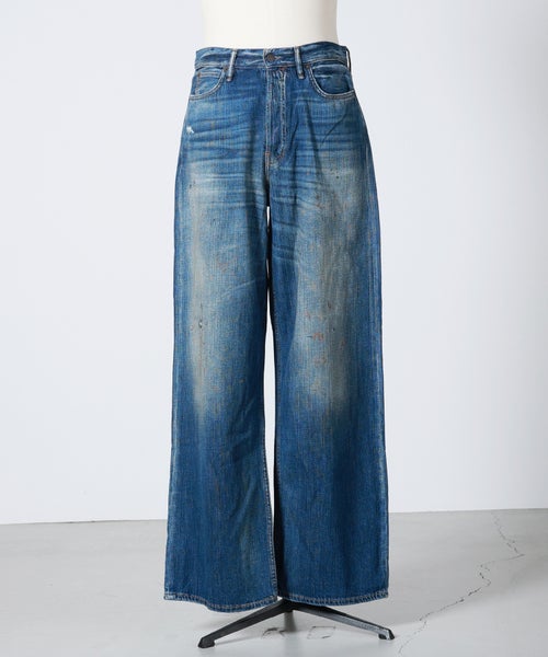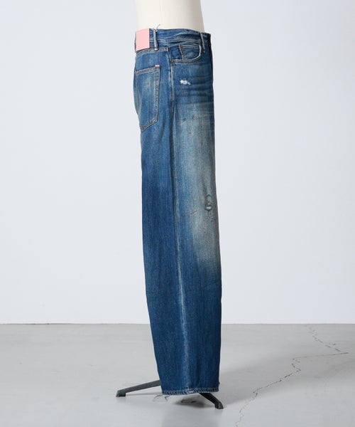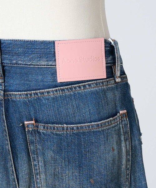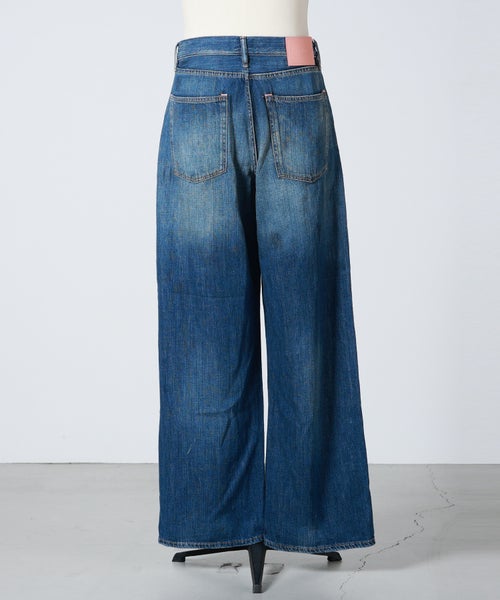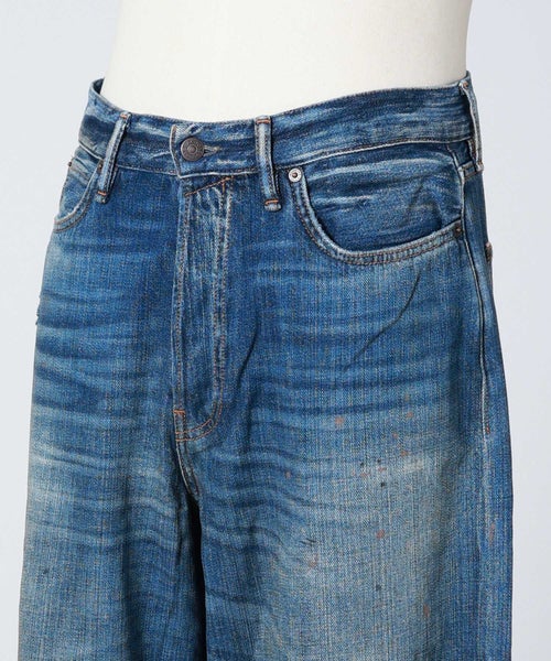【デザイン】Acne Studios(アクネストゥディオズ)のデニムパンツ。ルーズに織られたノンストレッチのスラブデニムを使用。ヴィンテージ風のブルーウォッシュ加工に手作業でペイントマーク、穴、ステイン加工を施し、履き込んだような風合いを表現しています。この加工は一点一点絶妙に異なり、アイテムごとに特別感のある5ポケットで、フロントはボタンフライの仕様になっております。1981ジーンズは、ローウエスト~ミッドウエスト、ワイドバギーレッグのルーズフィットスタイルが特徴的です。しっかりとボリュームのあるシルエットで存在感のある一本です。