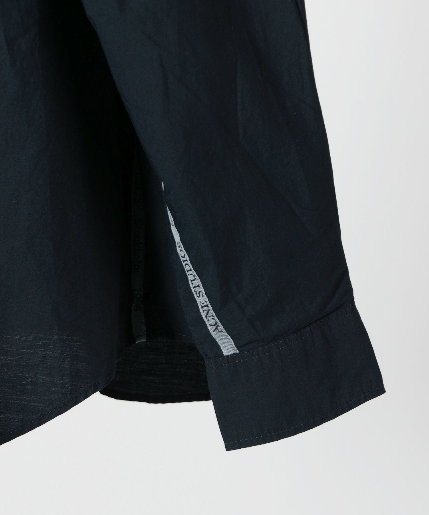 【デザイン】Acne Studios(アクネストゥディオズ)のシャツ。 軽量なコットンポプリンを用いた、クリーンで洗練されたボタンアップシャツです。全体はヒップ下まで届くリラックスフィットで、身体のラインを拾いすぎず、自然な余白を楽しめるシルエット。袖の内側にさりげなく配されたジャカードロゴのストライプが、ミニマルな佇まいの中にブランドらしい遊び心を添えています。胸元には実用性の高いポケットを配置し、日常使いにも配慮されたデザイン。1枚で着ても、ジャケットやニットのインナーとしてもバランスが取りやすく、オン・オフ問わず活理解できる汎用性の高さが魅力です。