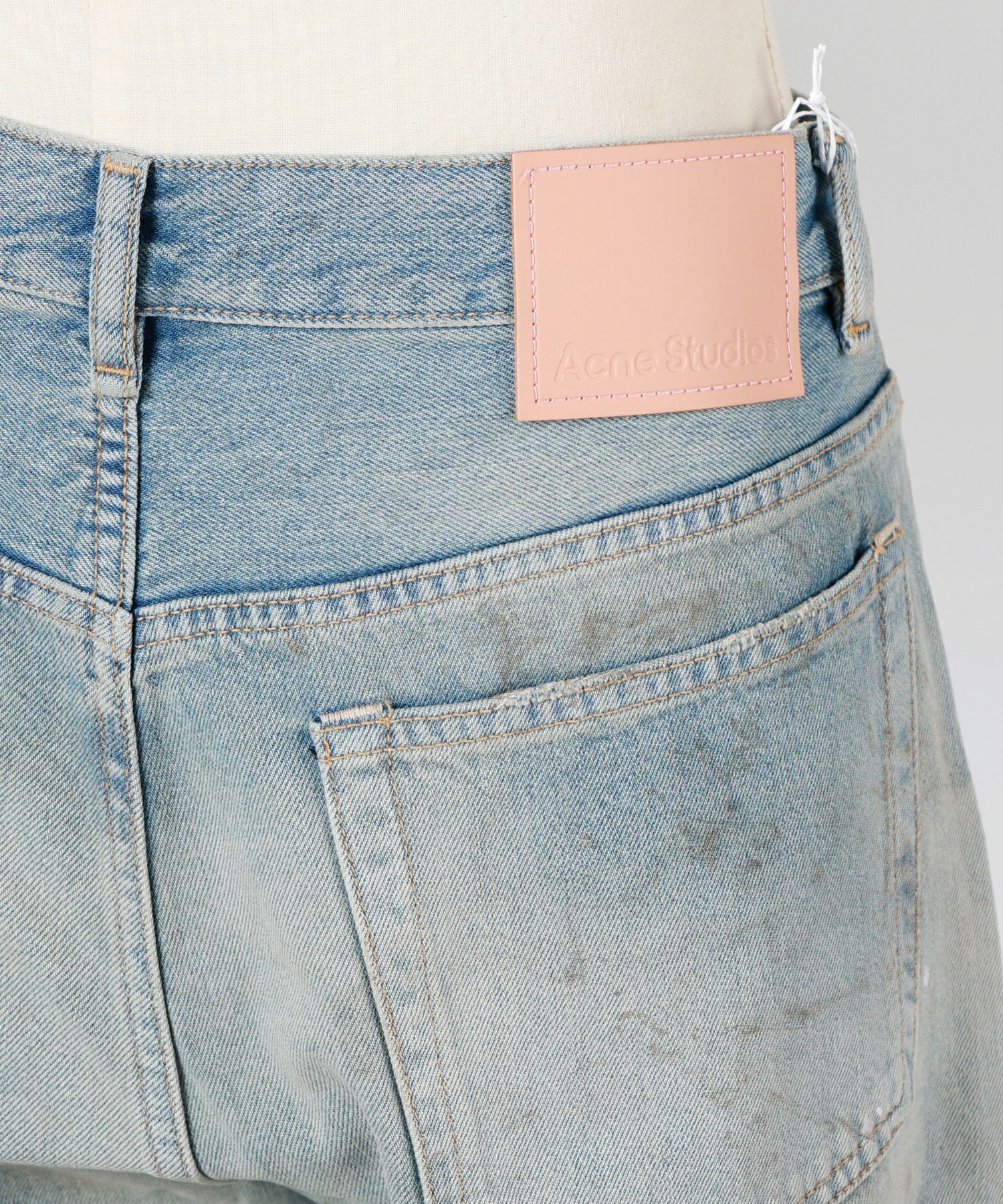 【デザイン】Acne Studios(アクネストゥディオズ)のデニムパンツ。ミッドウエストで、ルーズフィットのシルエットが特徴的なデザインです。ワイドレッグと長めの丈が、カジュアルながらもスタイリッシュな印象を与え、リラックスした雰囲気で着こなせます。ライトブルーウォッシュのリジッドデニムを使用し、着色・ペイント加工に施されたマークがユニークなディテールを加え、個性的で存在感のある仕上がりに。ファイブポケットデザインとボタンフライで、クラシックなジーンズらしさを感じさせつつ、イタリア製ならではの洗練された仕上がりです。
