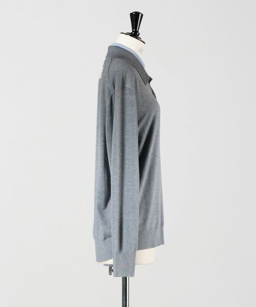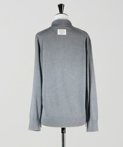 【素材】 シルクをベースに、ウールとカシミヤをブレンドした贅沢なニット素材を使用。さらりとした肌ざわりで軽やかな着心地ながら、二重編みによるふんわりとした立体感があり、しっとりとした柔らかさも兼ね備えています。シルク特有の自然な光沢感が上品さを引き立て、ラグジュアリーな印象を演出。肌に直接触れても心地よく、長時間の着用でもストレスを感じにくい仕上がりです。季節の変わり目や室内での羽織りとしても最適な一枚です。