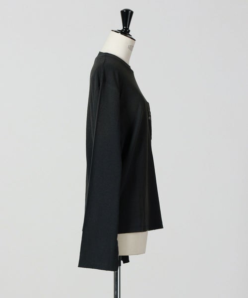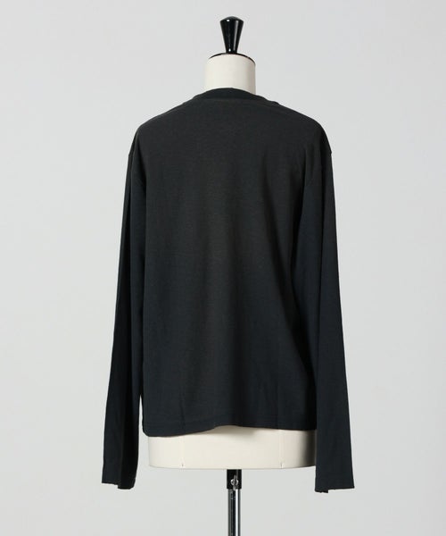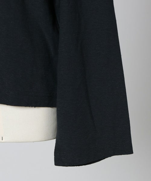 【素材】ジャージー素材を使用。触れるとドライでナチュラルな質感があり、ヘンプ特有のシャリ感が心地よい肌触りです。着用すると軽やかで通気性が良く、長時間でも快適。表面はやや不規則で、ヴィンテージライクな表情があり、シンプルながらも奥行きのある見た目に仕上がっています。しっかりとした生地感で透けにくく、季節の変わり目にも安心して着用できる素材です。