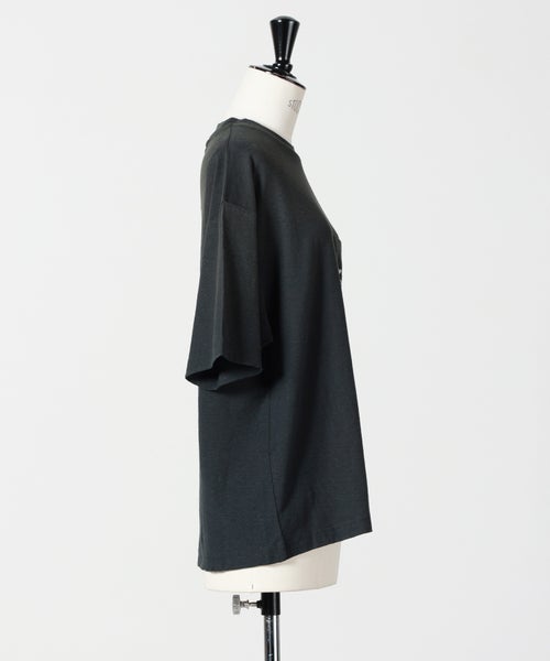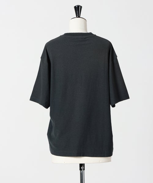 【素材】 オーガニックコットンを使用したジャージー素材。やわらかな肌当たりと自然なストレッチ性を備え、快適な着心地を実現しています。不均一な編み地とスプレー加工により、アイテムごとに異なる表情を持つのも特徴。天然素材ならではのナチュラルな風合いと、加工による奥行きのある質感を楽しめる一着です。