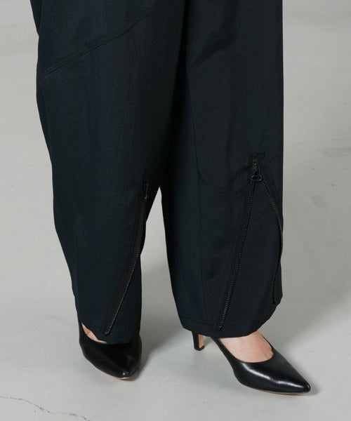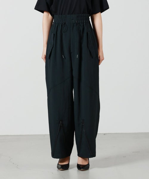 【デザイン】AKANE UTSUNOMIYA(アカネウツノミヤ)のパンツ。ミリタリーパンツをベースにデザインされた、モード感と実用性を兼ね備えた一本です。裾にはファスナー開きの仕様が施されており、閉じればすっきりとしたテーパードシルエットに、開けばストレートラインのラフな印象に変化。シーンや気分に合わせてシルエットのアレンジが楽しめます。ウエストはゴム仕様で、内側の紐でフィット感の調整が可能。長時間の着用でもストレスフリーな履き心地を実現します。程よいゆとりのあるシルエットは、タイトすぎずルーズすぎず、トップスを選ばず幅広いスタイリングにマッチ。スタイリッシュなブラックカラーは、シーズンレスで活躍します。
