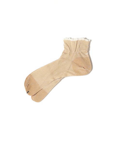 【デザイン】 antipast(アンティパスト)のソックス。さらりとした薄手の生地で、夏でも快適なやわらかな履き心地に仕上げたタビ型ソックスです。タビ型ならではの設計で指先が動かしやすく、足にしっかりフィットするため、さまざまな履き物と相性よくお使いいただけます。シンプルなデザインの中に、履き口のゴム部分にあしらわれたフリルがさりげないアクセントをプラス。甘くなりすぎない上品なディテールで、足元に程よい華やかさを添えてくれる一足です。