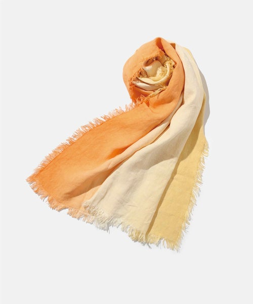 【デザイン】「身につけるだけでわくわく、心躍るようなアート作品のようなストールを作りたい」との思いで作られたストール。3色に染め分けたリネン100%の3本の糸を1本の糸に撚り合わせ、3色メランジに織り上げています。そして、その織りあげたストールを製品染め工房にて、熟練の職人が1点ずつ2色のディップダイ(グラデーション染め)を行っています。2色のディップダイを行うためには、1色染めてから丸一日乾かし、翌日に2色目を染めるという手間のかかる作業です。生地に3色メランジの糸を使うことで、ディップダイの境目がとても美しく仕上がっています。