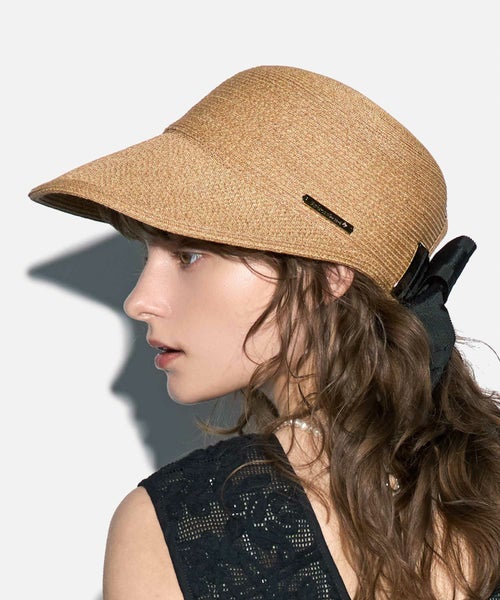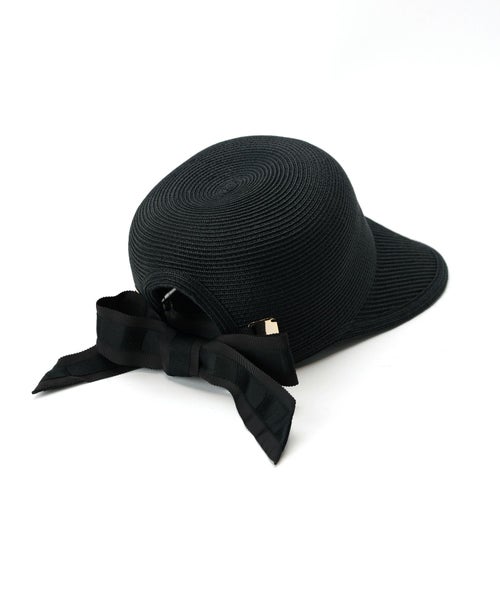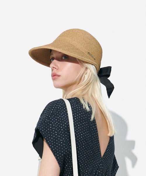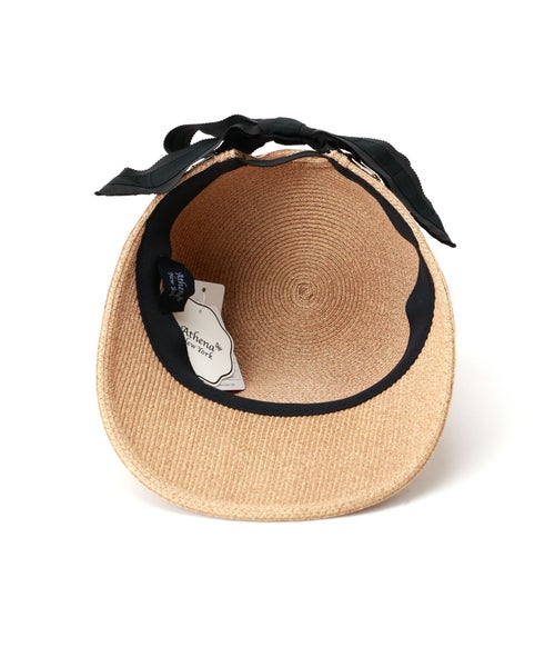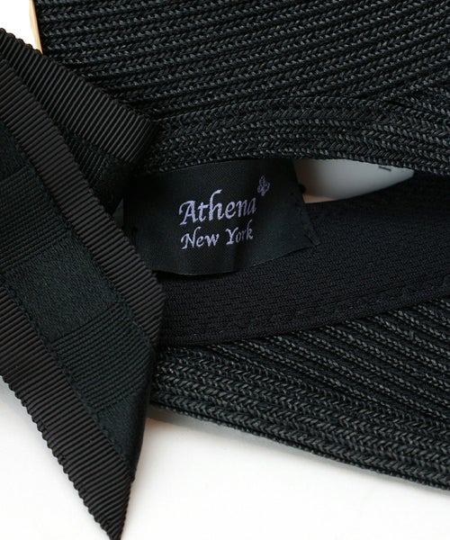 【デザイン】Athena New York(アシーナニューヨーク)のハット。後頭部をラウンドカットし、Athena New York オリジナルの存在感と高級感のある金具をラウンド部分の両側にアタッチし、この金具にリボンを通したAthena New Yorkの代表的なデザイン。 後頭部の金具に2種類のリボンを重ねて通してリボン結びにした遊び心のあるデザインのキャップです。 ヤングカジュアルになりがちなキャップ型の帽子が、ゴールドの金具と艶のあるリボンで "Athena New York" らしい大人ラグジュアリーなキャップ帽に仕上がっています。