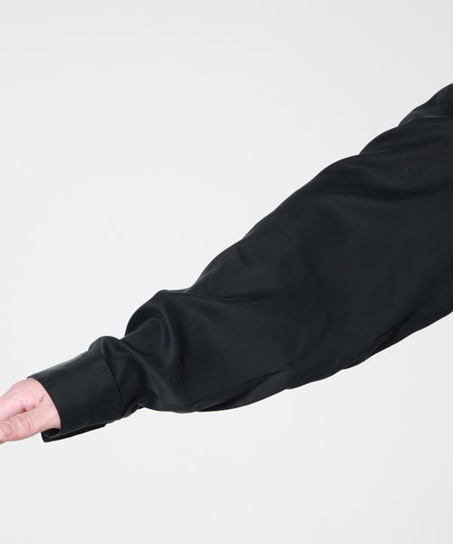【素材】タテ糸にハイマルチキュプラ、ヨコ糸にハイマルチポリエステルを使用したフィブリルサテン素材を採用。上品で控えめな光沢感があり、動きに合わせて自然な艶が生まれます。手に取ると感じるのは、パウダリーでしっとりとした滑らかなタッチ。肌離れが良く、軽やかでストレスの少ない着心地が魅力です。しなやかなドレープ性により、美しい落ち感がシルエットを引き立てます。表面はやや繊細なため、引っかかりや摩擦には注意が必要ですが、その分カジュアルなシャツにはない上質さと洗練された印象を楽しめる一着です。