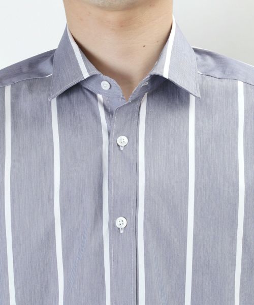 【デザイン】広めのピッチ幅が特徴のレギュラーシャツです。クリーンな印象を与えるストライプシャツながら広めのピッチ幅により男性らしさが際立ちます。ジャケットのインナーとしてはもちろんのこと、さらりとアウター感覚で羽織ることもできる万能なシャツとなっております。