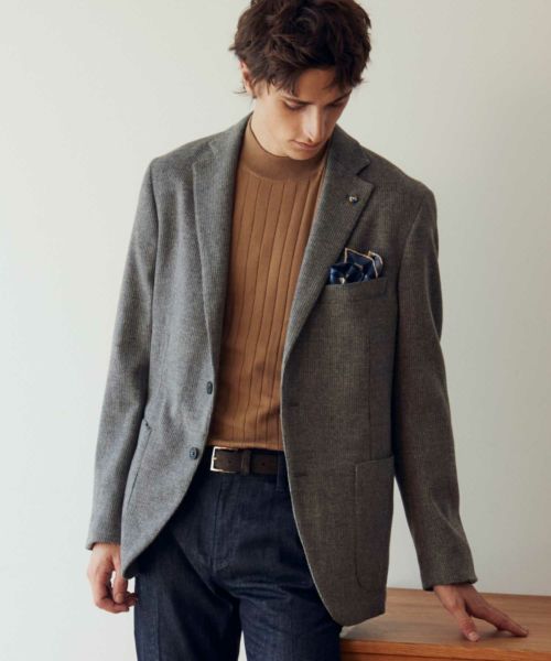 【素材】柔らかな肌触りが特徴のカシミア混ウールを使用。パッチポケットの上にはチェンジポケットを配し、ヤギ革で縁取られています。