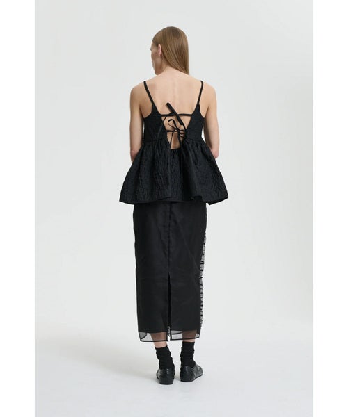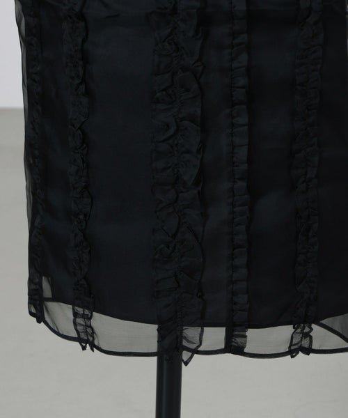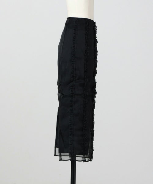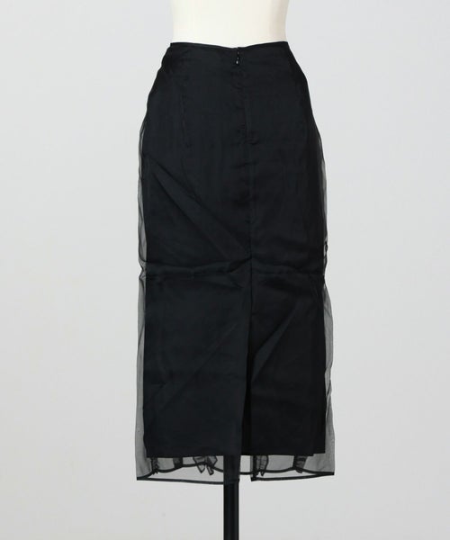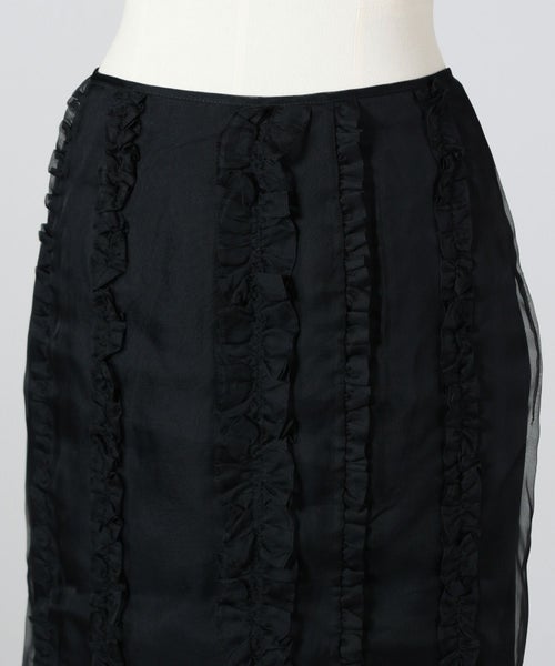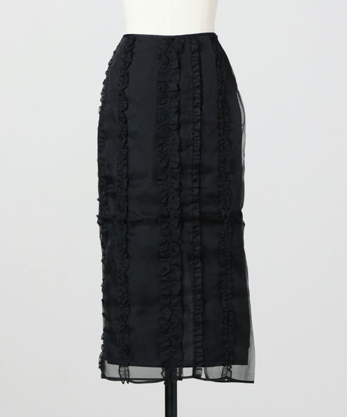 【デザイン】Cecilie Bahnsen(セシリー バンセン)のスカート。クラシカルなペンシルラインをベースに、ブラックオーガンジーで仕立てた一着です。身体のラインを美しく引き立て、すっきりと縦長に見せるシルエットが魅力。フロントにあしらわれた cascading ruffles(流れるようなラッフル)が軽やかな動きを添え、女性らしい優雅さを演出します。バックはセンタージップ仕様で、着脱のしやすさとシームレスな仕上がりを両立。フォーマルな場面からドレスアップシーンまで幅広く活躍する、タイムレスなデザインです。