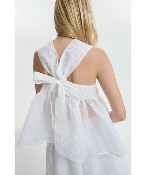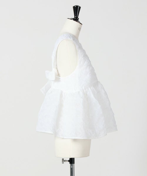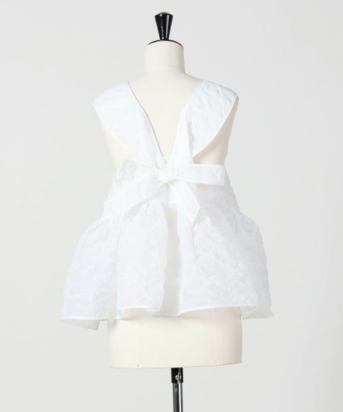 【デザイン】 Cecilie Bahnsen(セシリー バンセン)のトップス。プルメリア柄のマトラッセ素材を用い、ボリュームと繊細なディテールを丁寧に表現した一着。ベビードールシルエットが柔らかに広がり、自然な立体感を描くペプラムラインが、軽やかでフェミニンな印象を与えます。首元はハイネック仕様で、肩のラインをエレガントに引き立てながら、全体のバランスを美しく整えます。背中にはクロスリボンを配し、ボディスを程よく引き締めることで、セシリー バンセンらしいロマンチックで洗練された後ろ姿を完成させています。