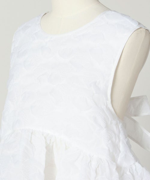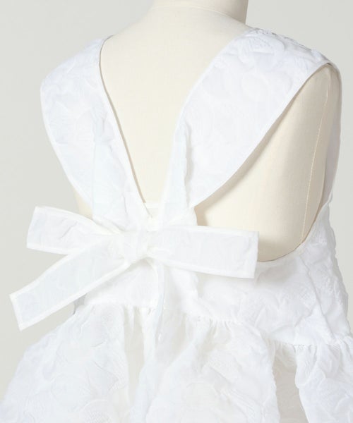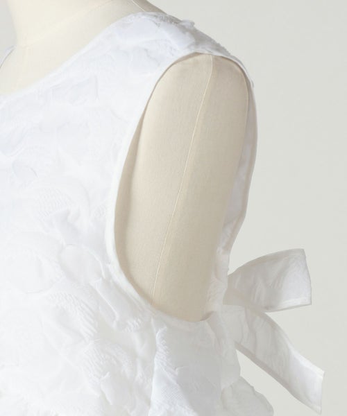 【素材】 ふっくらとした凹凸感がありながらも軽やかで、動くたびに陰影が生まれ、装いに奥行きを与えるプルメリアモチーフのマトラッセ生地を使用。構築的なシルエットを美しく保ちながらも、やわらかな着心地で、ホワイトカラーが素材の表情をより際立たせ、清潔感と華やかさを両立します。