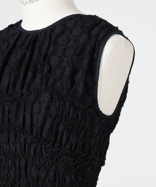 【素材】コットン100%を使用。織りによって表現された柄が自然な凹凸感を生み、空気を含むような軽やかさと適度なハリ感を両立します。繊細でありながらシルエットを美しく保つ、表情豊かな素材感が特徴です。