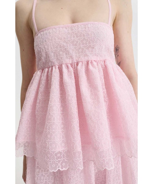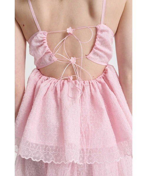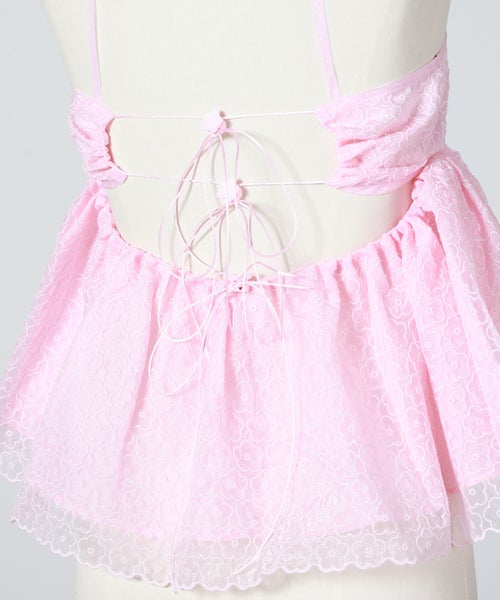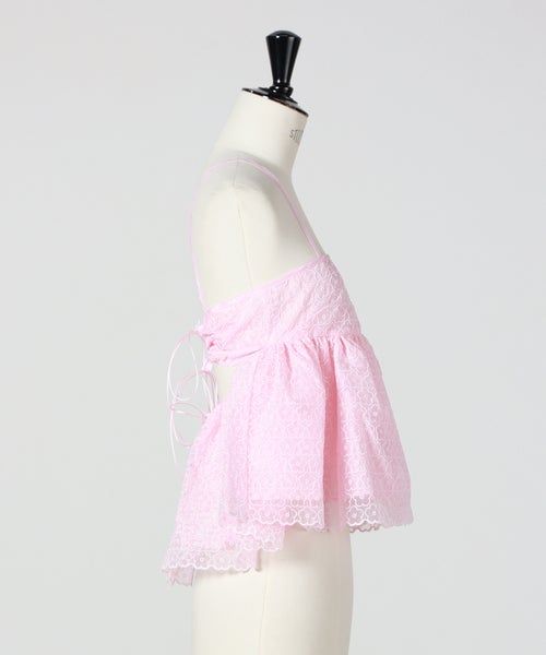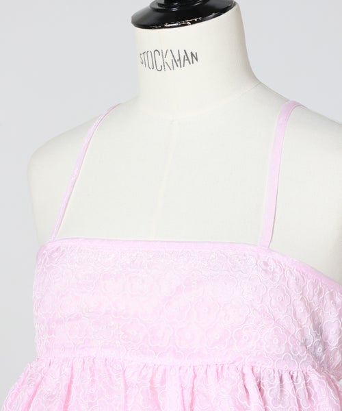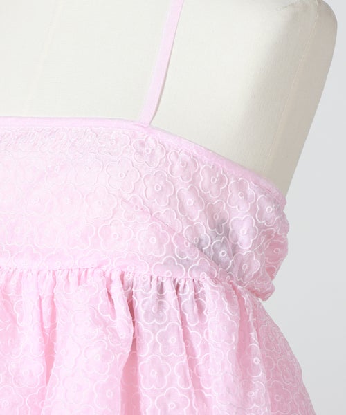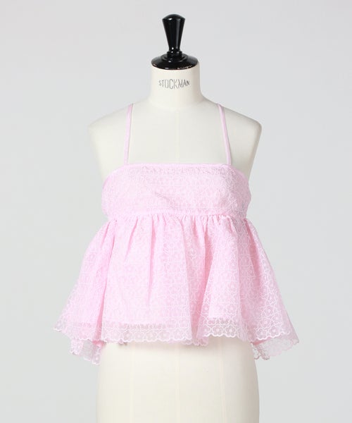 【デザイン】 Cecilie Bahnsen(セシリー バンセン)のトップス。繊細なフラワーモチーフを立体的に表現した、シグネチャーのウィンドフラワー刺繍が特徴的です。コンパクトなバンドゥボディをベースに、ボリュームのあるペプラムシルエットを組み合わせた女性らしさを演出する設計です。背面にはフラワーモチーフの留め具、華奢なショルダーストラップと、背面にあしらわれたリボンディテールが軽やかな抜け感を添え、バックスタイルまで美しく仕上げられています。