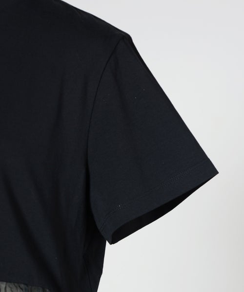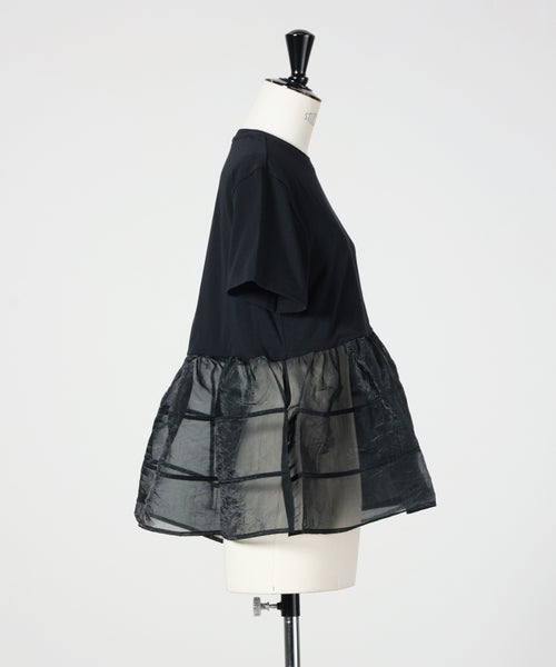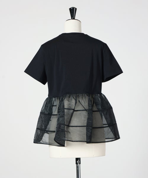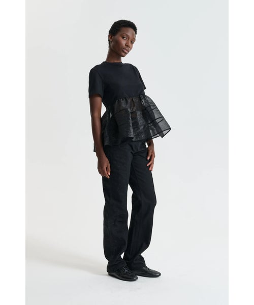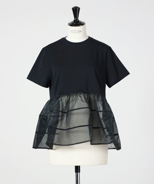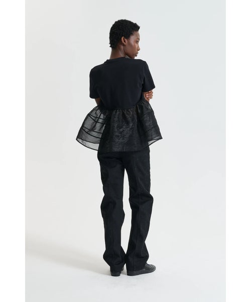 【デザイン】 Cecilie Bahnsen(セシリー バンセン)のトップス。ミニマルなTシャツをベースに、シアーなティアードディテールを重ねた立体的なデザインが特徴です。裾にかけて緩やかに広がるペプラムシルエットが、動きに合わせて軽やかな表情を生み出し、フェミニンな印象を引き立てます。異素材のコントラストが奥行きを与え、シンプルながらも存在感を与えるアイテムに仕上がっています。
