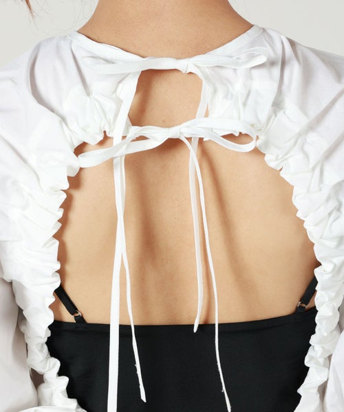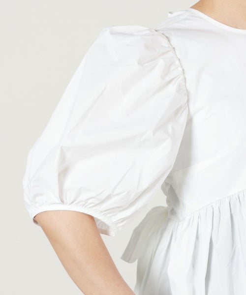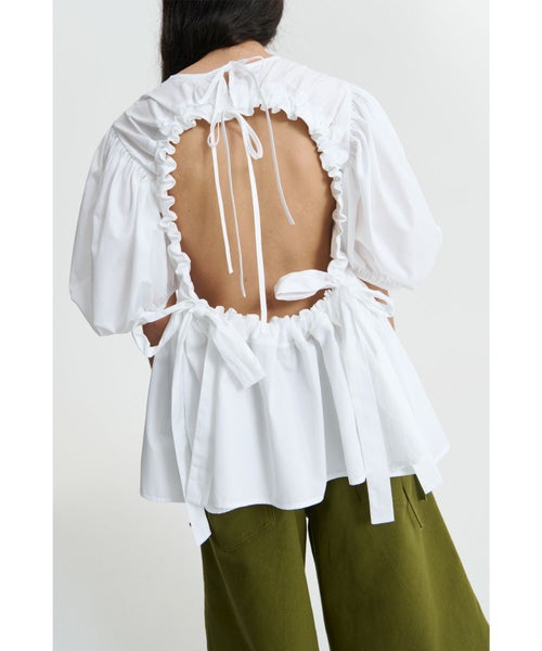 【デザイン】Cecilie Bahnsen(セシリー バンセン)のブラウス。Anishaトップは、ブランドならではの意外性を持つデザインが特徴です。シグネチャーであるふんわりとしたパフスリーブとベビードールシルエットが可愛らしさを引き立てる一方、背中に大きなカットアウトが施され、ドラマチックなリボンがトップを引き締めています。背面のキーホールクローズと、二つのタイがディテールにアクセントを加え、女性らしいエレガントな印象を与えます。