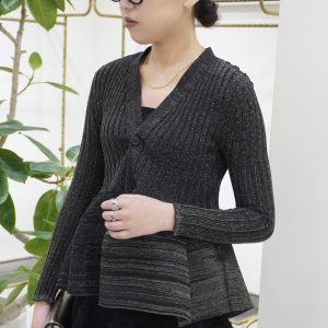 【素材】ポリエステル58%(再生ポリエステル使用)、ナイロン42%。軽やかで柔らかな素材感が特徴で、フレアの動きを美しく表現します。毛足のある糸が表面に立体感と温かみを生み、ラメ糸がさりげない輝きを添えます。伸縮性はほとんどありませんが、ウエストゴム仕様で快適に着用でき、長時間の着用でもストレスなく過ごせます。