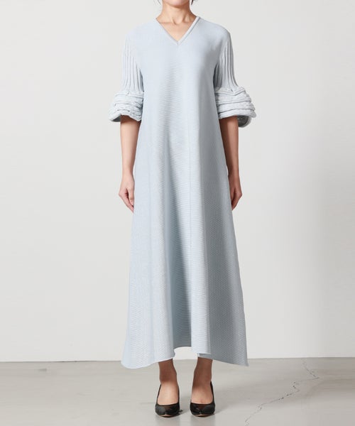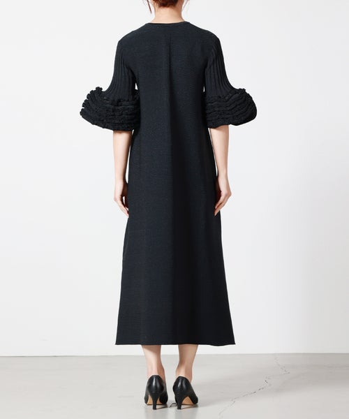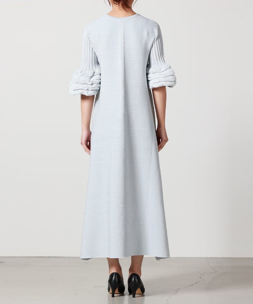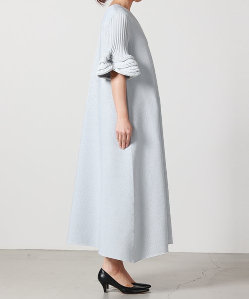 【デザイン】CFCL(シーエフシーエル)のワンピース。透け感のある部分と透けない部分をボーダー状に切り替えた、立体的な編み地が印象的な一着です。視覚的なリズムが生まれることで、シンプルながらも奥行きのある佇まいに。デコルテをすっきりと見せるVネックは、シャープになりすぎず上品な抜け感を演出します。身体のラインを拾いすぎない程よいシルエットとミディ丈のバランスで、一枚でも安心感のある着用感。縫い代のごろつきが少ないシームレス仕様のため、肌あたりも滑らかです。袖先には特徴的な編み地を施し、さりげないアクセントに。なお、編み地の特性上、袖のヘムラインには個体差がございます。風合いの一部としてお楽しみいただけますと幸いです。フラットシューズで軽やかに、ヒールやブーツでモードにと、合わせる小物次第で印象を変えていただけます。