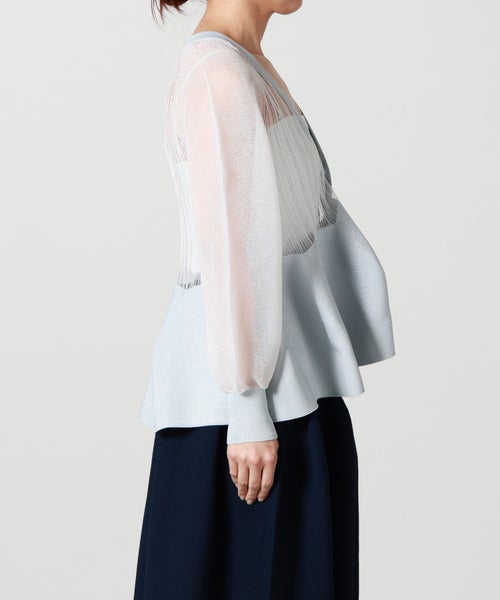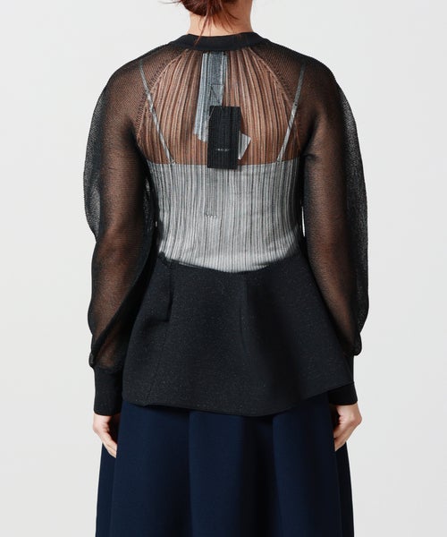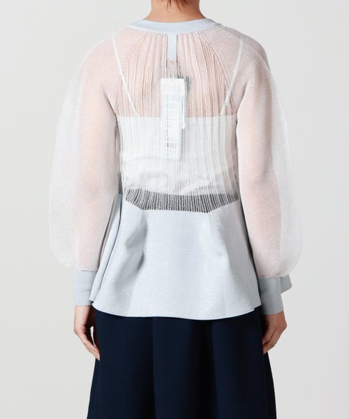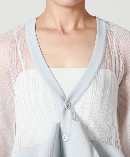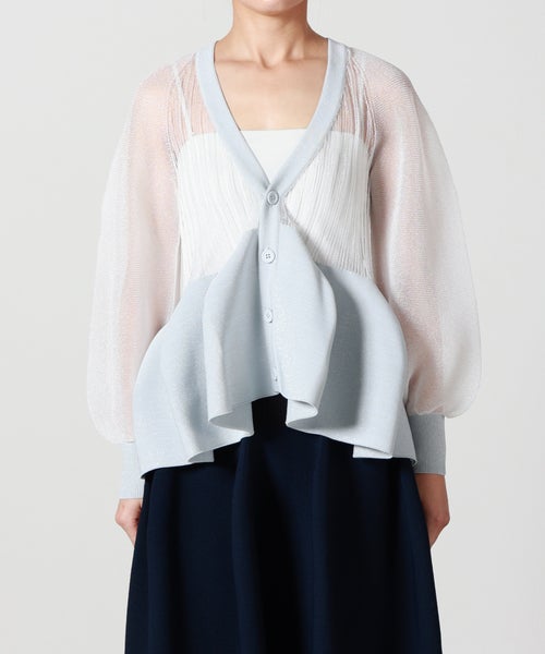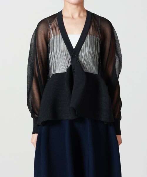 【デザイン】CFCL(シーエフシーエル)のニットカーデガン。コンピュータープログラミングによって作られたボリューム感のある立体的なブランドのアイコン的フォルムが特徴です。全面にラメ糸が編み込まれ、ボリュームのあるパフスリーブとシアー切り替えが華やかでありながら軽やかさも演出してくれます。