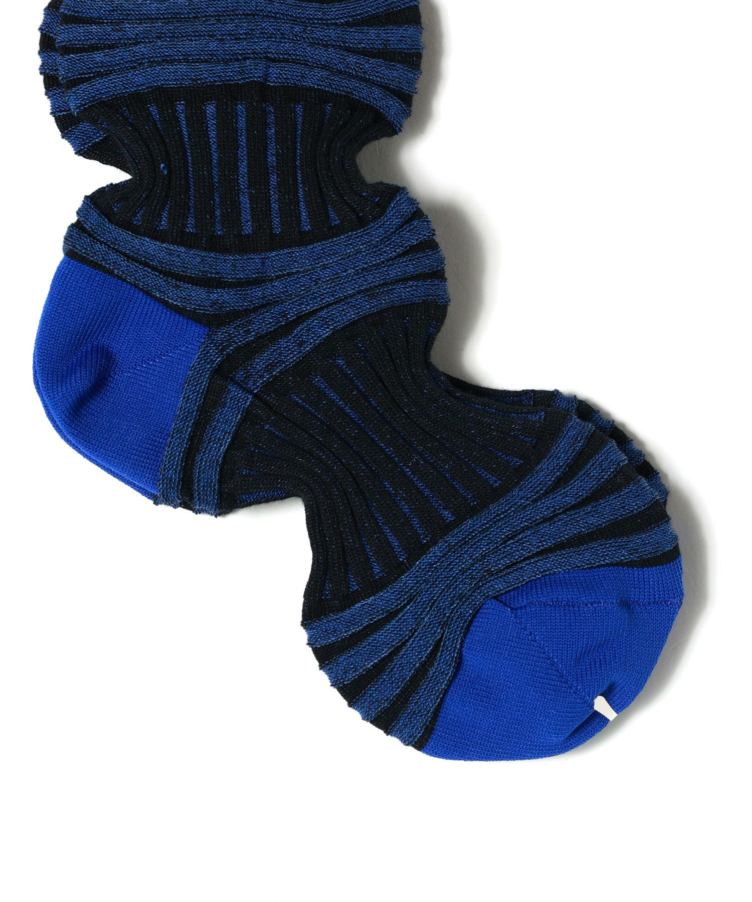 【デザイン】CFCL(シーエフシーエル)の靴下。ガーターとリブを組み合わせた編み地が特徴。つま先、踵、履き口部分に再生ポリエステルを使用。それ以外の部分にオーガニックコットンを使用したサステナブルなアイテムです。