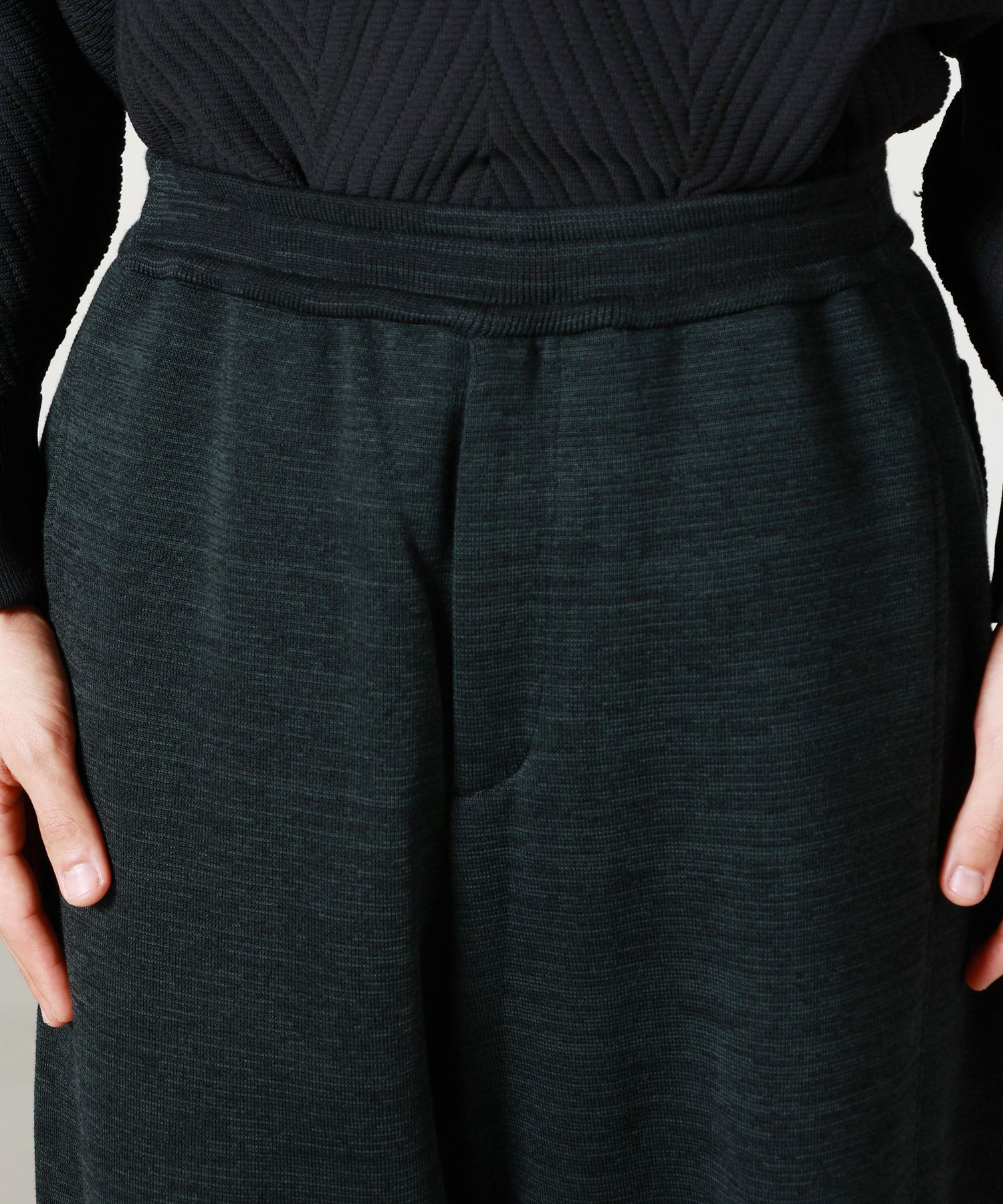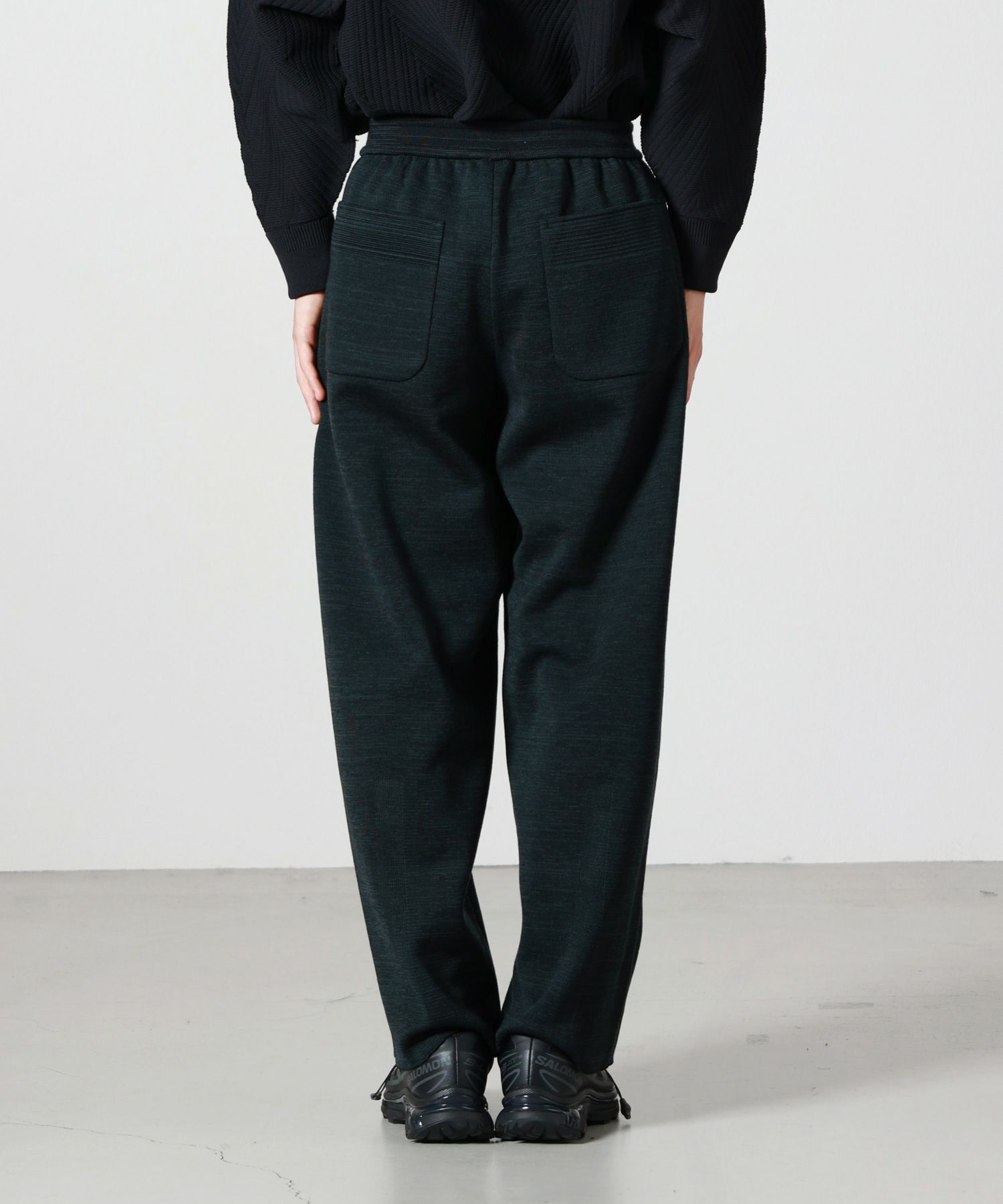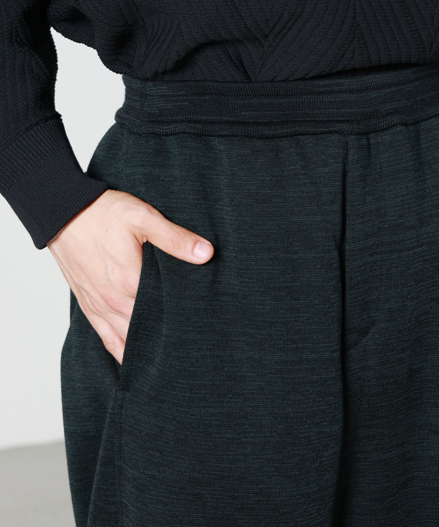 【素材】ウール84%、ポリエステル16%(再生ポリエステル使用)。しっとりと柔らかなウールの風合いに、ポリエステルをブレンドすることで軽さと耐久性をプラスしています。手に取ると弾力のある編地が心地よく、穿いた瞬間から包み込まれるような安心感を得られる素材感。見た目にはふくらみと立体感があり、シルエットを美しく引き立てます。秋冬のシーズンにぴったりな温かみを持ちながらも重たさはなく、長時間快適に着用できるのも魅力です。