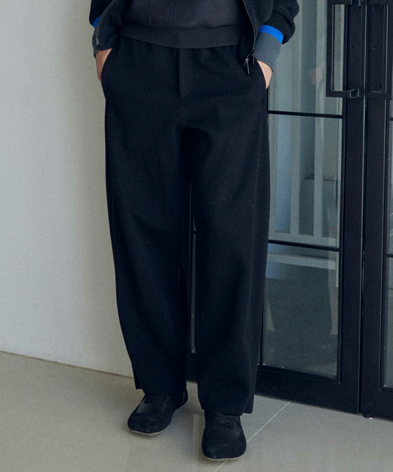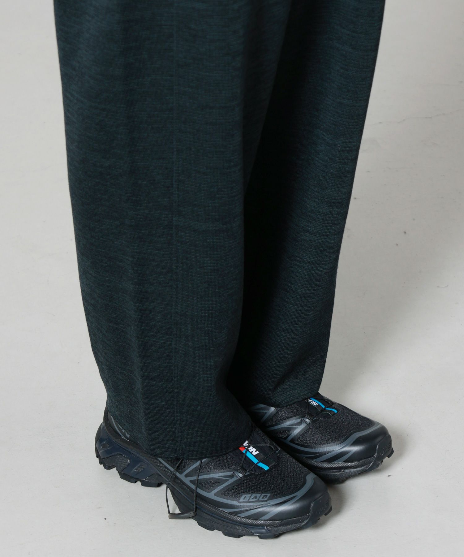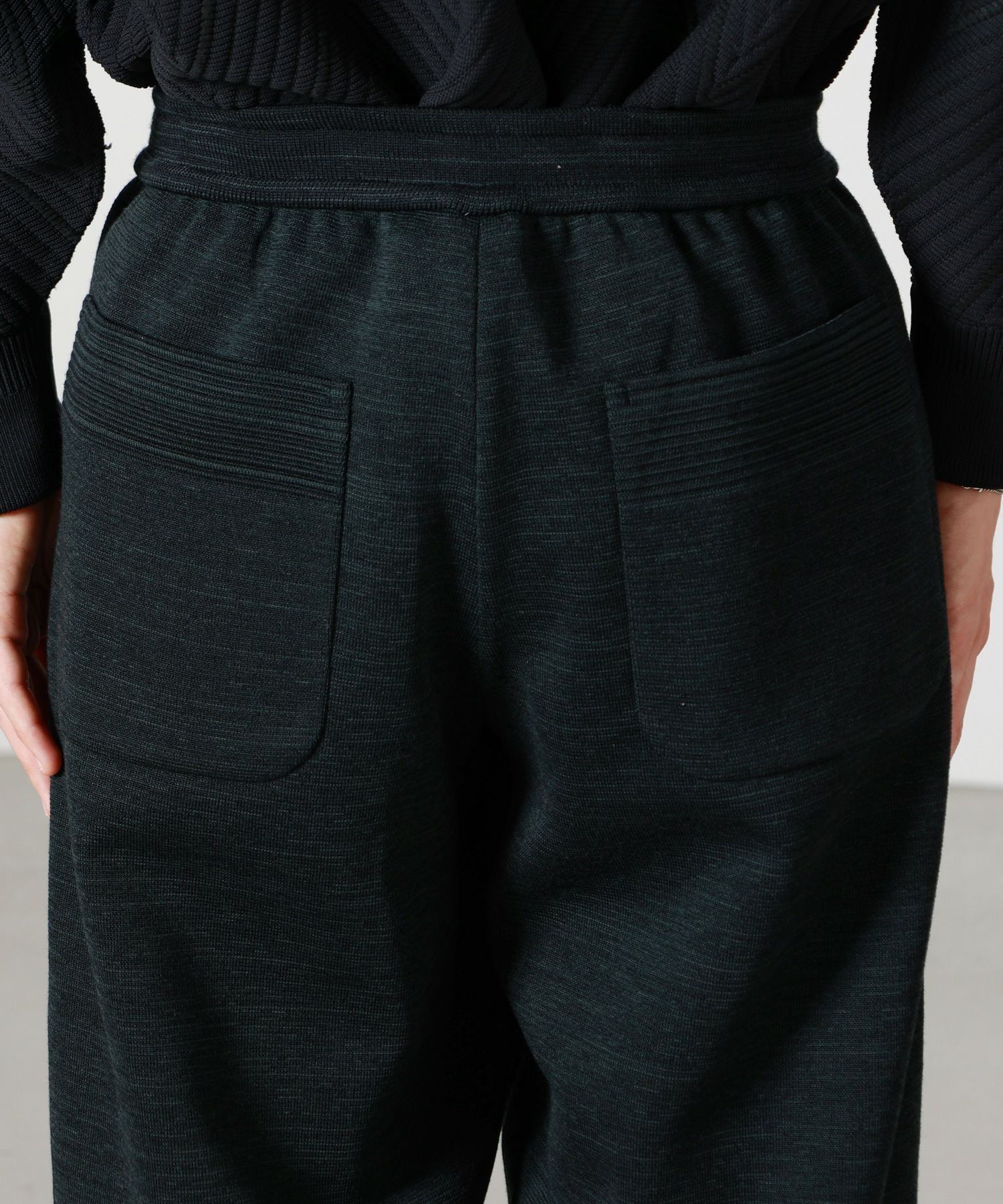 【素材】ウール84%、ポリエステル16%(再生ポリエステル使用)。しっとりと柔らかなウールの風合いに、ポリエステルをブレンドすることで軽さと耐久性をプラスしています。手に取ると弾力のある編地が心地よく、穿いた瞬間から包み込まれるような安心感を得られる素材感。見た目にはふくらみと立体感があり、シルエットを美しく引き立てます。秋冬のシーズンにぴったりな温かみを持ちながらも重たさはなく、長時間快適に着用できるのも魅力です。