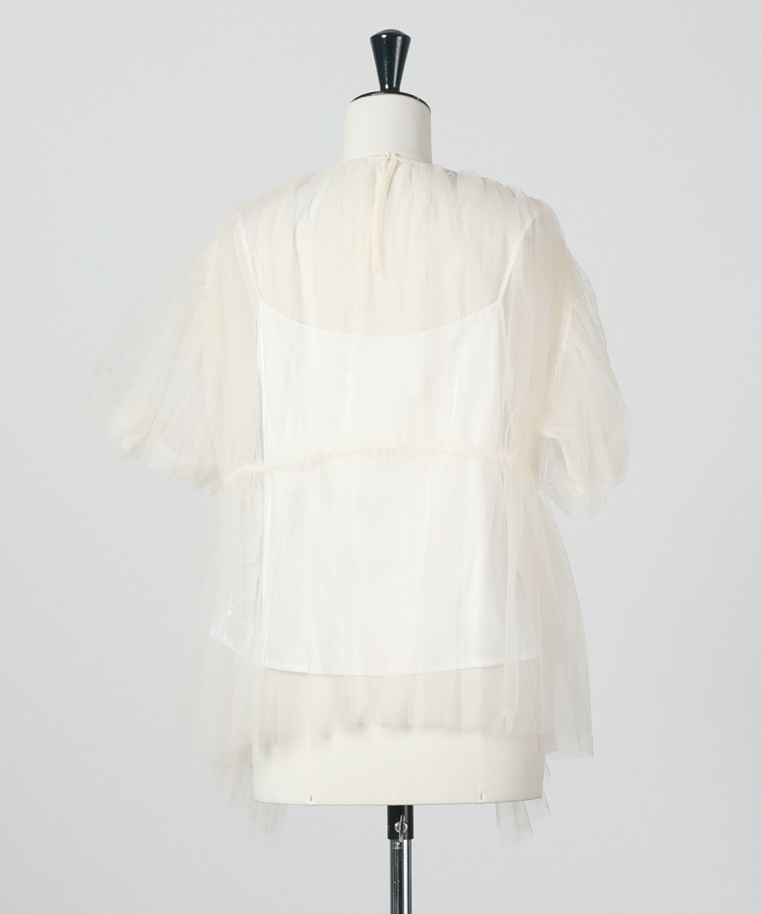 【デザイン】Chika Kisada(チカ キサダ)のチュールトップス。ブランドを象徴するチュール素材を用いた、軽やかで女性らしい表情が魅力の一着です。透け感のあるトップスとインナーがセットになっており、レイヤードを計算せずともバランスの取れたスタイリングが完成します。お手持ちのドレスやインナーなどインナーを調整すればオールシーズンで着回せるため、1年を通してさまざまなコーディネートに取り入れやすいのも魅力です。