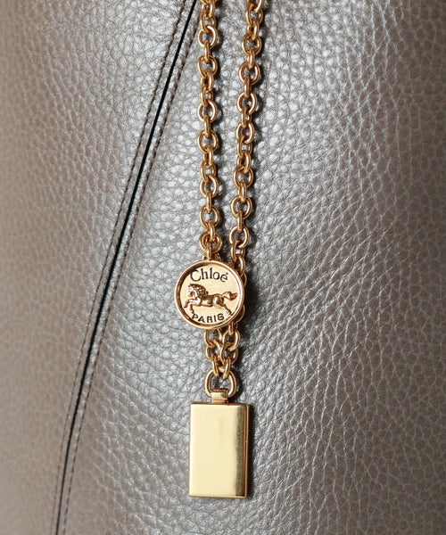 【デザイン】Chloe(クロエ) のバッグ。グラフィックなラインがミニマルなシルエットを引き立て、揺れるチェーンにはメゾンのシグネチャーであるChloe&Horseメダルがあしらわれています。肩に掛けることもでき、ハンドルをリングに通せばリラックスしたハンドキャリーもお楽しみいただけるバッグです。
