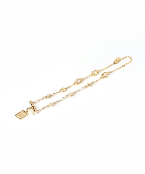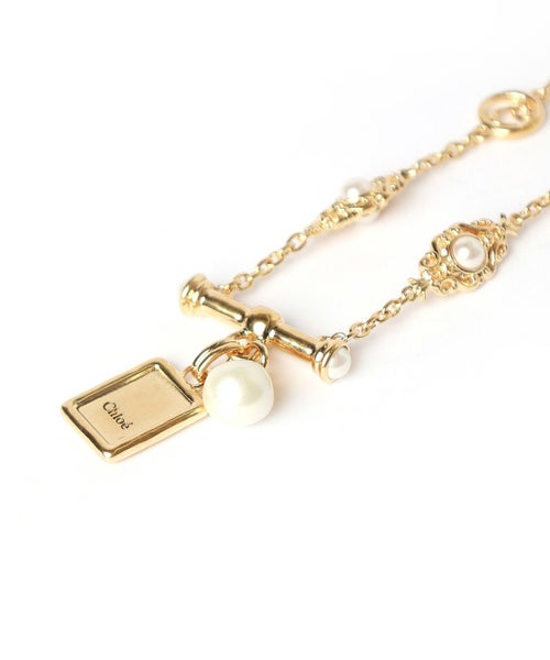 【デザイン】Chloe(クロエ)のネックレス。上品なゴールドトーンの真鍮(ブラス)をベースに、筆記体で描かれた"C"のメダルと、樹脂製パールをあしらった装飾パーツが連なり、優雅な揺らめきを演出します。中央には、樹脂製パールのペンダントがTバーリンクでセットされ、その上にはChloeロゴの刻印入りプレートが煌めくアクセントとして添えられています。長さ調整可能なので、スタイルや首元の印象に合わせて調整できます。控えめながらも確かな存在感で、特別な日から日常まで、あらゆるシーンに華やかさと女性らしさを与えてくれる逸品です。