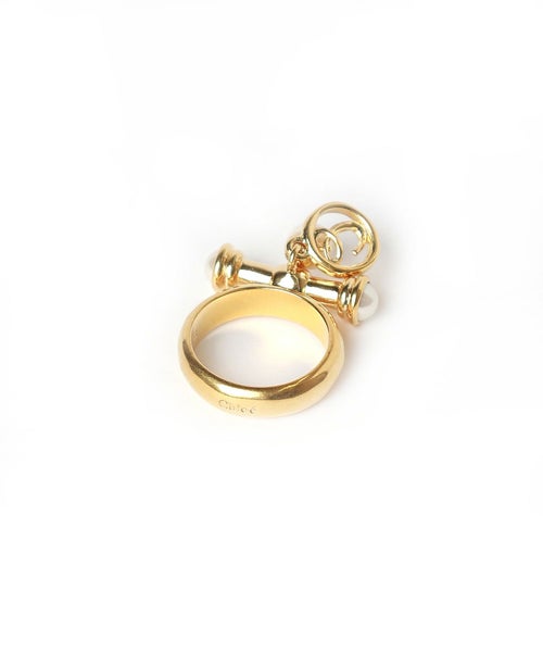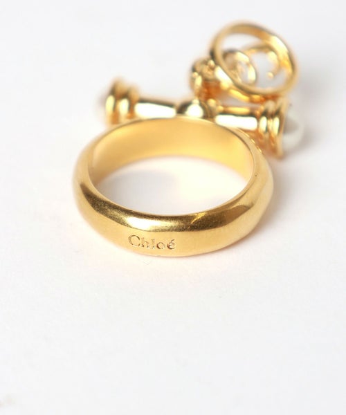 【デザイン】Chloe(クロエ)のリング。上品なゴールドトーンの真鍮(ブラス)をベースに、樹脂製パールをあしらったTバーが印象的。そこから配された筆記体で描かれた"C"のメダルと、クリアなガラスパールが、優雅な揺らめきを演出します。まだ、Chloeのロゴ刻印が施されており、細部まで上質さを感じさせるデザインとなっています。華やかさと女性らしさを贅沢に感じさせる魅力的なアイテムです。