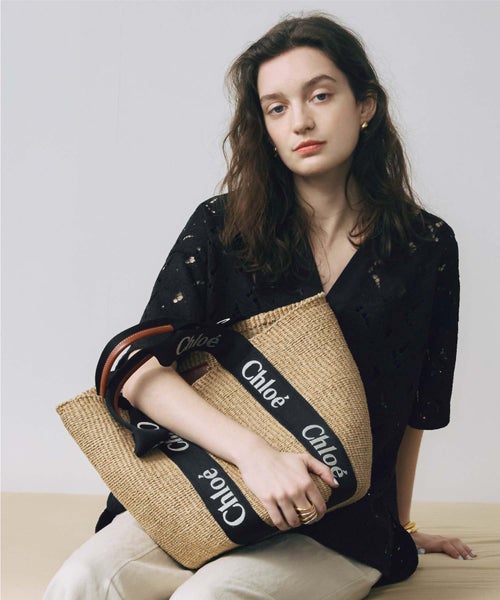 【デザイン】Chloe(クロエ)のバスケットシェイプが心地よい夏のムードを演出するWoodyラージバスケット。ナチュラルな風合いの中に、洗練された都会的エッセンスを感じさせるデザインです。ケニアの独立した女性職人が、一部素材をアップサイクルしながら丁寧に手作業で編み上げることで、ひとつひとつに表情と温もりを宿しています。天然繊維の素朴な質感に、Chloeロゴを刺繍したウェビングを配し、グラフィカルなコントラストとメゾンらしいシグネチャーをプラス。バッグの底部には「Chloe」の文字を型押ししたレザーパッチをあしらい、耐久性と上質感を両立。自然体でありながらも細部まで美意識が行き届いた、夏のスタイリングを格上げするバスケットバッグです。