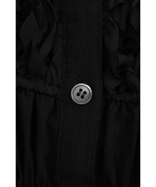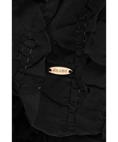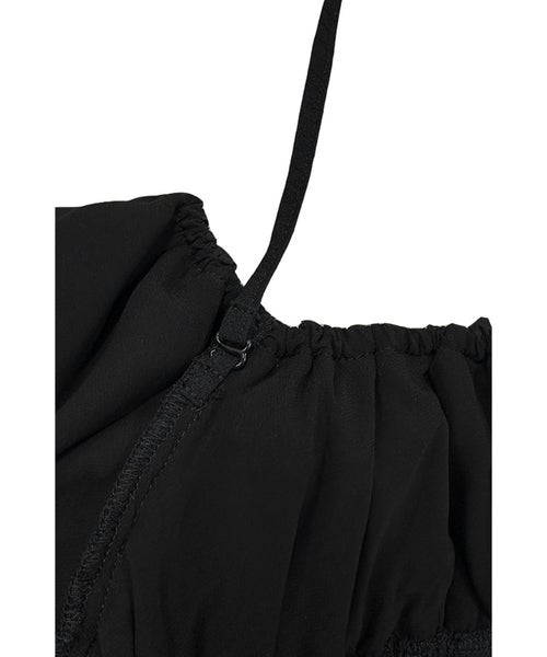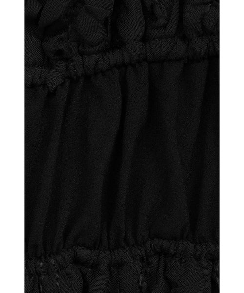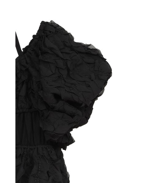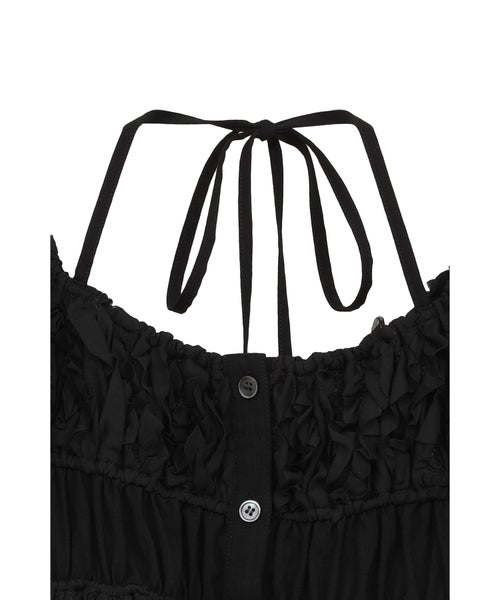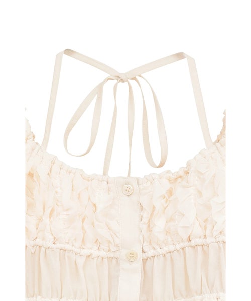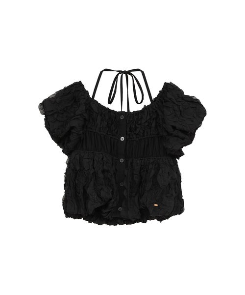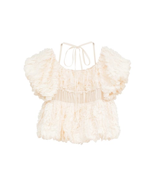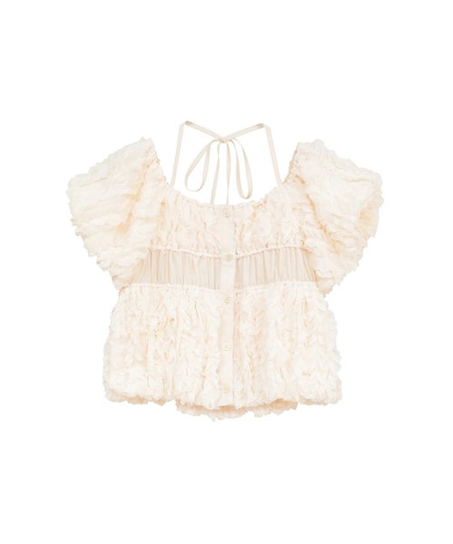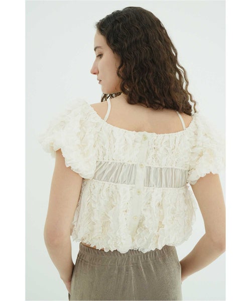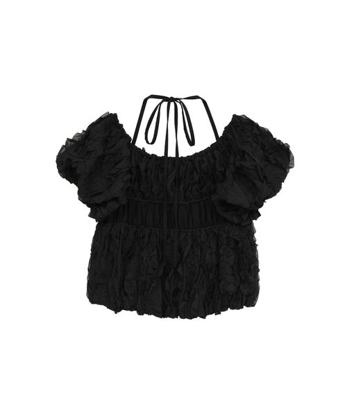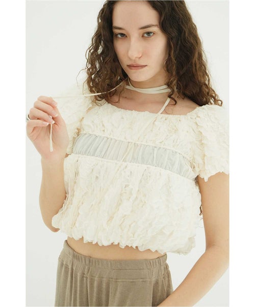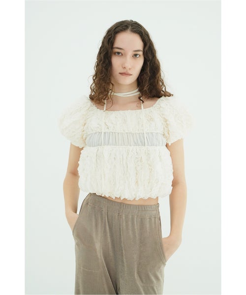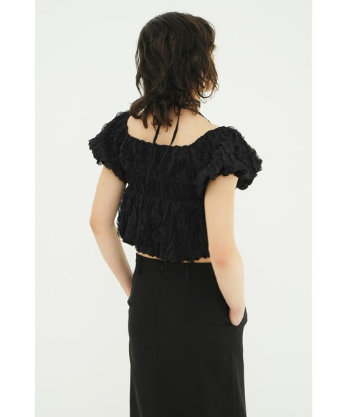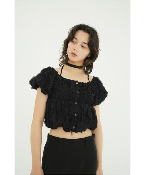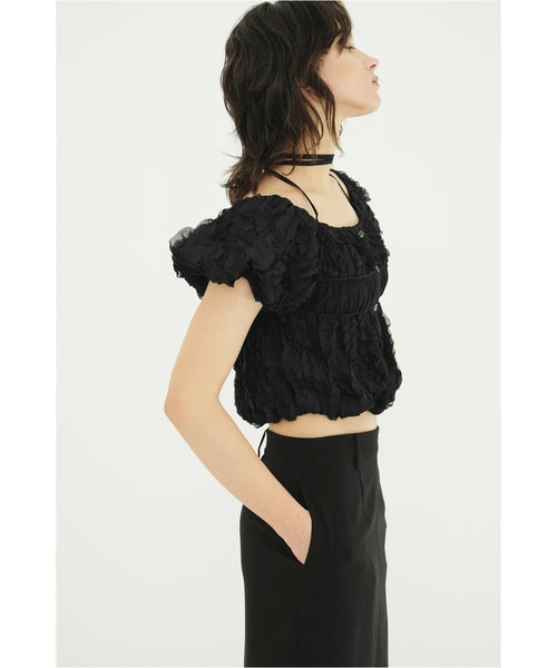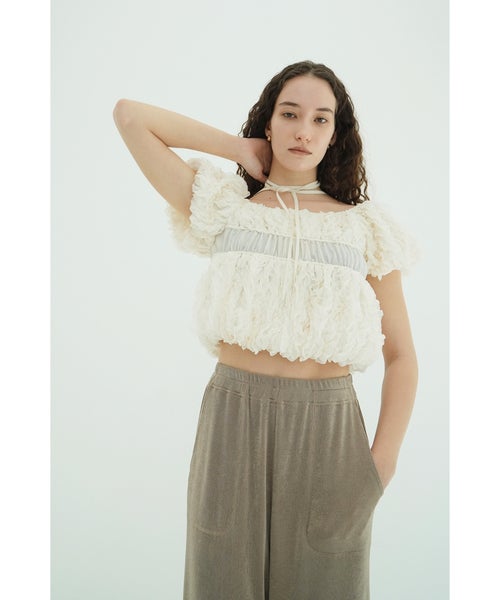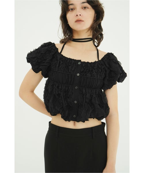 【デザイン】 CLANE(クラネ)のトップス。表情感のあるほのかなシアー素材に、程よいハリのあるフリルを太番手であしらったデザイントップスです。甘さを抑えたモードな印象に仕上げ、フェミニンさとエッジを絶妙にバランスさせています。異素材をミックスしたボディのシャーリングと立体的なフォルムが、着るだけでスタイリングに華やかさをプラス。取り外し可能なストリングデザインで首元のアレンジが楽しめるほか、袖はやや下げてオフショルダーとしても着用可能な2WAY仕様です。さりげなくあしらったロゴチャームがアクセントとなり、一枚で着映えする存在感のあるアイテムです。