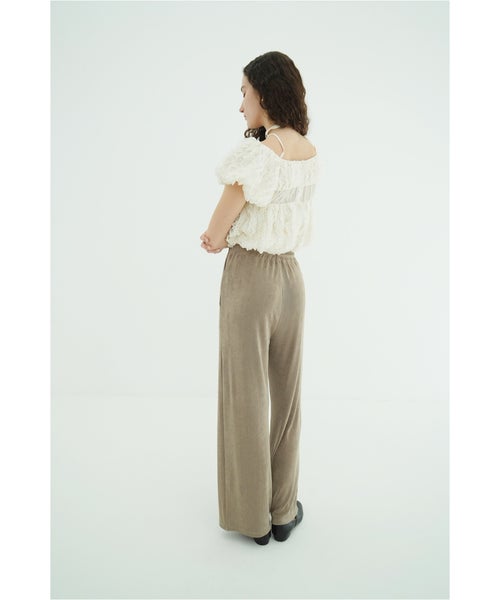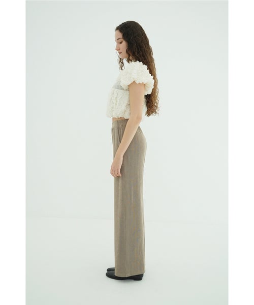 【素材】 基布にはポリエステルをベースにポリウレタンをブレンドし、軽やかさと伸縮性を兼ね備えたシアー素材を使用。別布や裏地にもポリエステルを中心に採用し、安定感のある仕上がりに。さらにレーヨンやナイロンを組み合わせた異素材使いにより、柔らかさと適度なハリ感を両立しています。立体的なフォルムを美しく保ちながら、快適な着心地を叶える一枚です。
