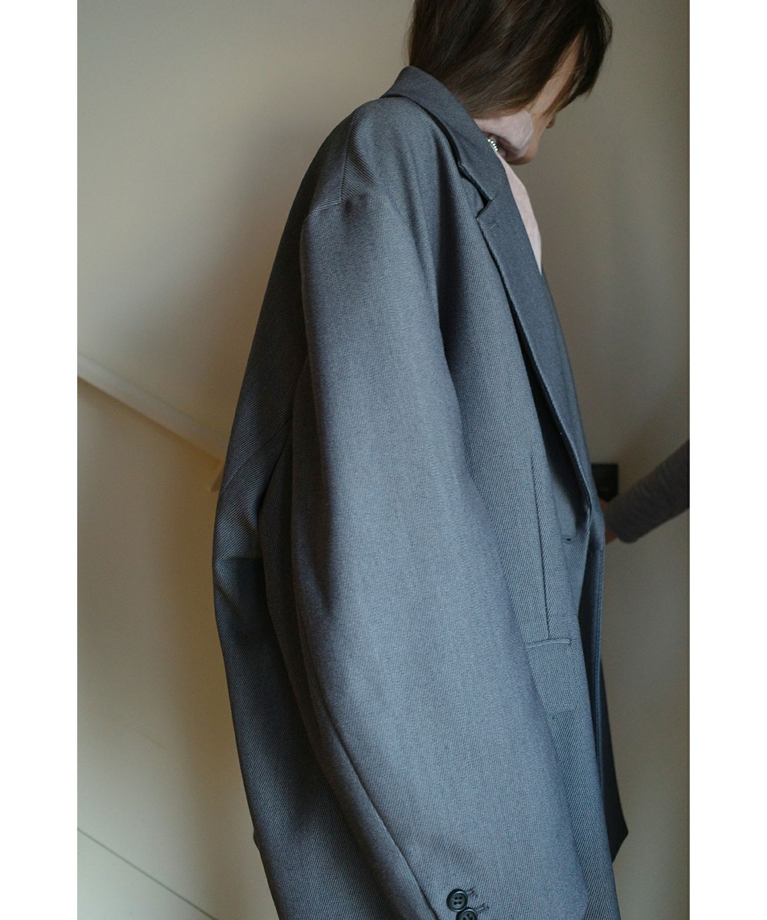 【デザイン】 CLANE(クラネ)のオーバーサイズのテーラードジャケット。 通常のジャケットシルエットに加え、左外脇に配した釦と、右脇の内側に施したタブ&釦ホールを留めることで、ウエストに程よいシェイプが生まれ、立体感のある女性らしいシルエットでの着こなしが可能です。ラペル部分にも釦とホールを備えており、襟を立てた着こなしで、よりシャープでモードな印象の着こなしも楽しめます。袖裏には滑りのよい裏地を使用し、袖口は折り返すと内側のコットン地がさりげなく見える切り替え仕様に。細部にまで計算されたデザインで、着るたびに新しい表情が楽しめます。