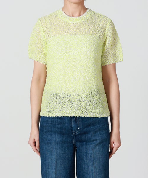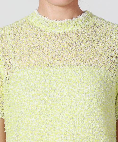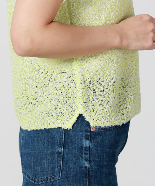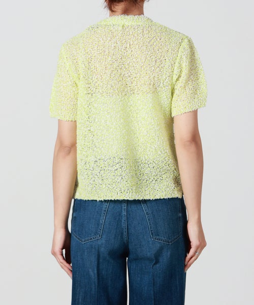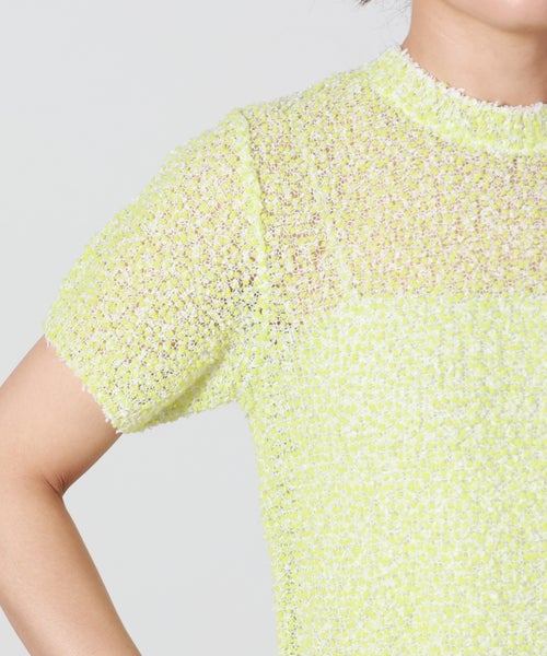 【素材】 ピンと立った毛羽が特徴のモール糸をベースに、キュプラ混のファンシーヤーンを使用。キュプラ・ポリエステル・ナイロンの混紡素材で、軽やかさとしなやかさを兼ね備えています。ざっくりと編まれた大きめの編み目は通気性に優れ、風通しが良く夏でも快適な着心地。さらりとしたドライタッチで肌離れも良く、見た目の立体感と軽やかさを両立しています。手洗い可能で扱いやすく、デザイン性と実用性を兼ね備えた素材感も魅力です。