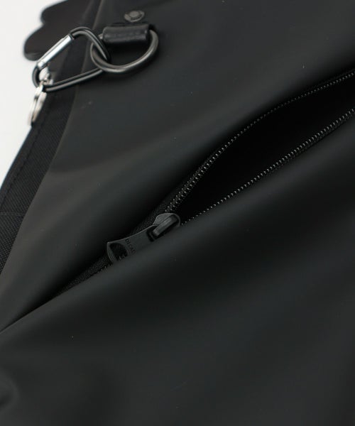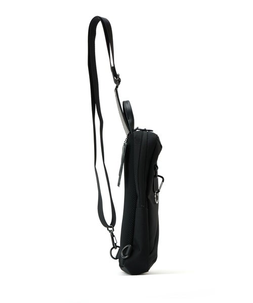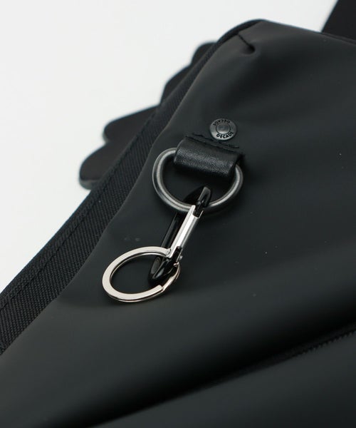 【デザイン】 DECADE(ディケイド)のボディバッグ。中央に配したZIPポケットが機能性とデザインアクセントをプラスしてくれています。男性の普段使いにちょうどいいサイズ感。ボディのリングにはカラビナが配されており、鍵などを吊るすことが出来ます。軽量で傷がつきにくく撥水性の高いポリウレタン100%の素材を使用しています。通常のポリウレタンと比較しても加水分解やひび割れなどが起きにくく、永く愛用いただける素材です。