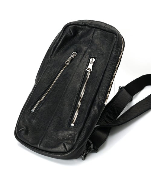 【デザイン】八の字のダブルジップが特徴のボディーバッグ。オリジナルレザー素材はディア調の牛革を使用。しっとりと柔らかい肌触りが楽しめるオイルドカウレザーです。国内地の範囲を限定した原皮(牛)と兵庫県姫路のタンナーで鞣し、オイル加工を施した純国産のジャパンレザーです。