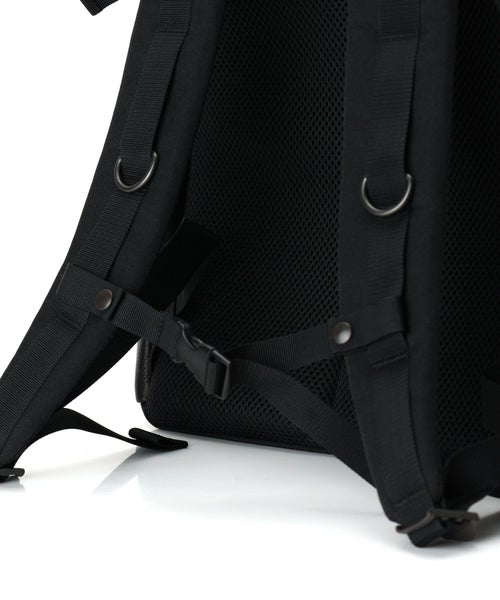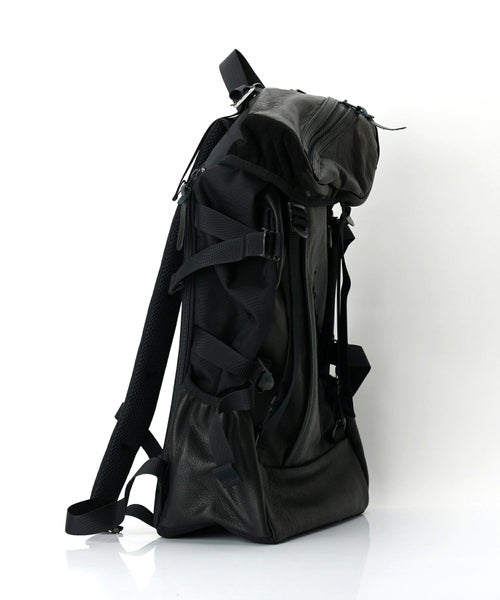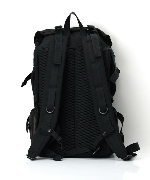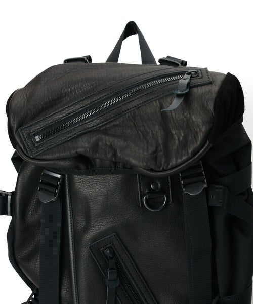 【デザイン】DECADE(ディケイド)のリュック。無骨さとシックさの両面を兼ねそろえた独創性なデザイン。素材には手袋等によく用いられ、柔軟でしっとりした質感が特徴のオイルドレザーとナイロンの表面にマットコーティングを施したラバーライクな異素材コンビネーション。背面にはメッシュの蒸れ防止と背中への負担軽減のクッションパッドを使用。前面ポケットとフラップポケットには雨水がポケットに入らない様に止水仕様のジップです。