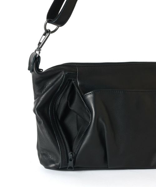 【デザイン】 フロントポケットと両サイドのジップポケットが特徴的なショルダーバッグ。口元もファスナー仕様でセキュリティ面も安心。ミドルサイズでA4サイズに対応しています。
