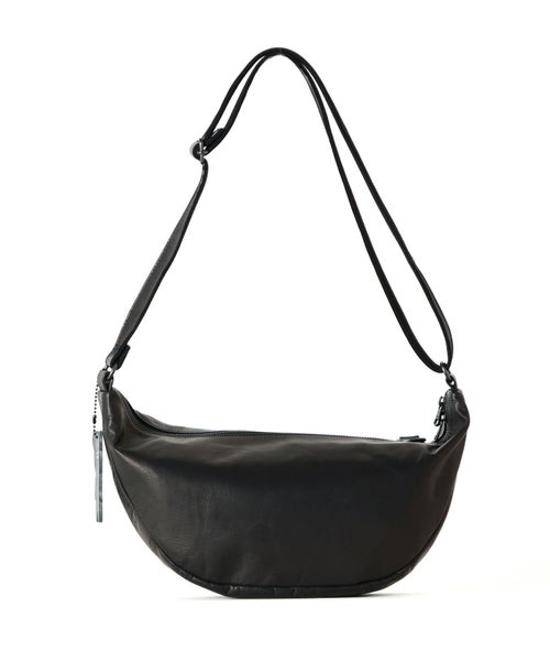 【デザイン】DECADE(ディケイド)のバッグ。半月型シルエットの飽きのこないシンプルデザインのショルダーバッグです。姫路産の馬革を使用。前面に斜めファスナーを装備して、使い勝手よくデザインされています。普段使いに使い易いサイズです。