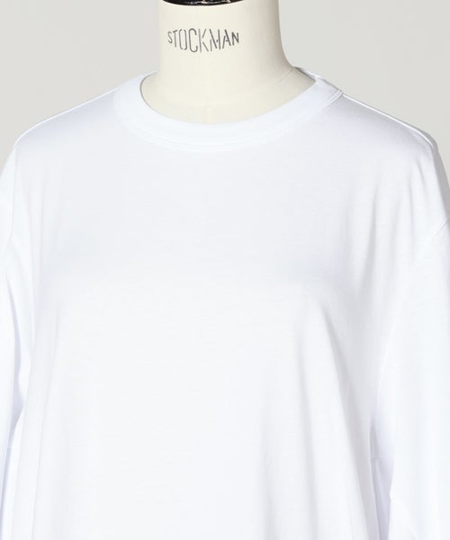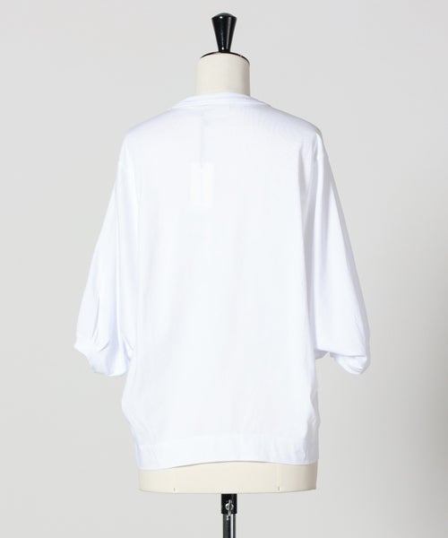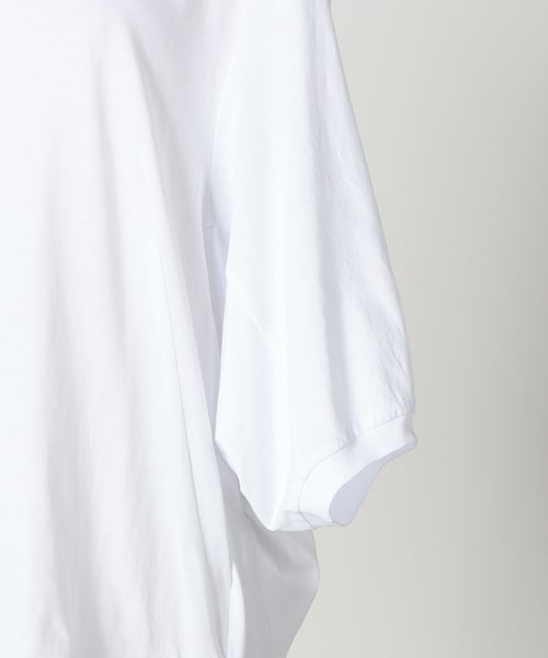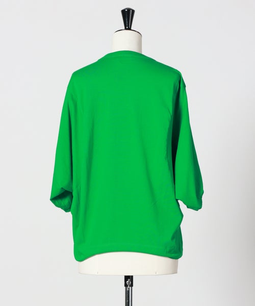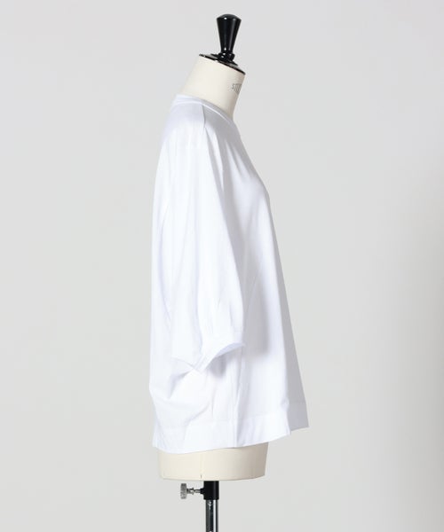【素材】 コットン素材を使用。さらりとしたドライなタッチで肌あたりが良く、デイリーに取り入れやすい快適な着心地が魅力です。程よいハリ感があり、ドルマンスリーブの立体的なシルエットを美しくキープ。通気性にも優れているため、季節の変わり目から夏場まで長く活躍します。ナチュラルな風合いのため、着用や洗濯によって多少のシワ感が出る場合がありますが、軽く整えることでラフな雰囲気としてお楽しみいただけます。
