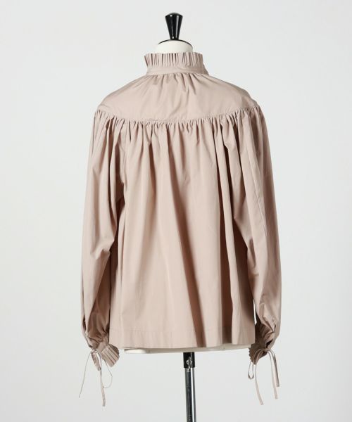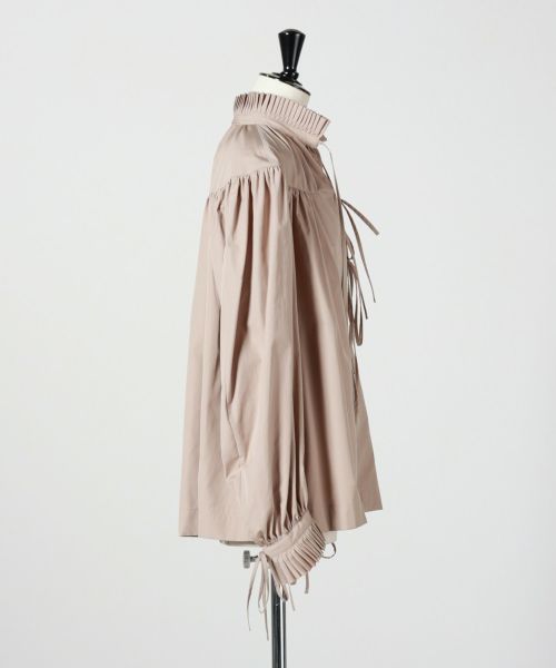 【素材】 コットンポプリンを使用。手に触れるとさらりとした清涼感があり、軽やかで程よいハリが特徴です。着用時には空気を含んだようなふくらみが生まれ、ラッフルやギャザーの立体感を美しくキープ。見た目はクリーンで上品ながら、コットンならではの通気性があり、長時間の着用でも快適です。