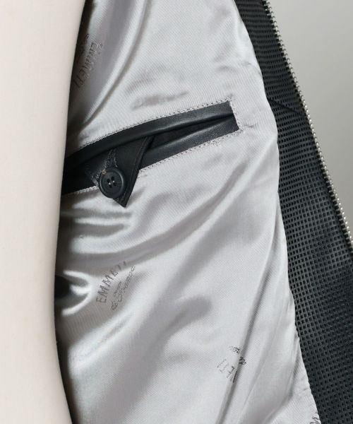 【デザイン】EMMTI(エンメティ)のレザージャケット。定番モデルの“MASSIMO”を干場義雅氏の完成で再解釈した別注ライダースです。変更点は通常の“MASSIMO”ではスプリットラグラン使用だった袖付けをセントインスリーブにしています。またパンチングレザーを採用しており「小丸型パンチング」に代えて、四角型のパンチングを取りれることで、よりスポーティーかつ個性的な印象に仕上げています。