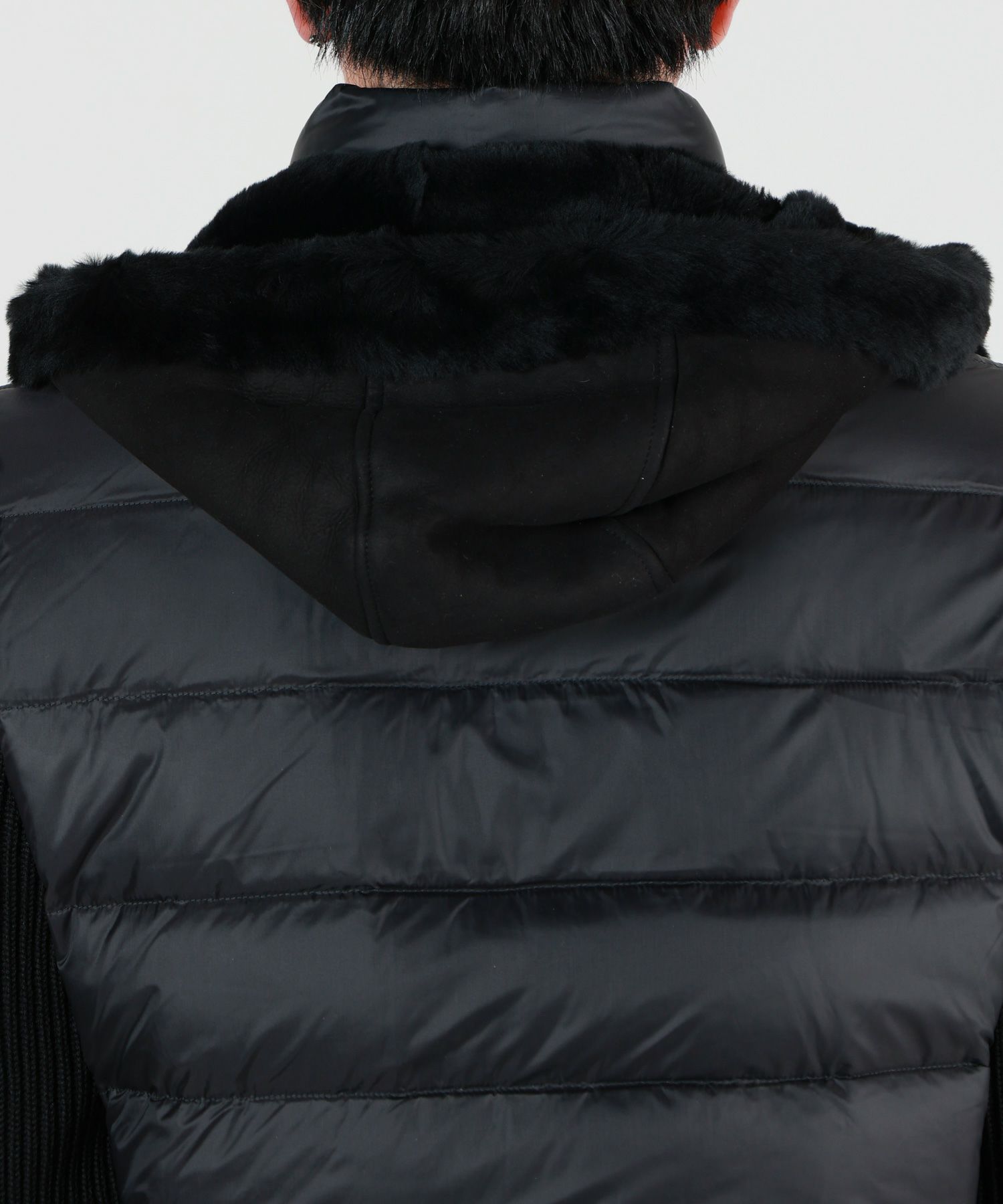 【デザイン】 EMMETI(エンメティ)のジャケット。NETTUNO身頃、袖、フードで素材を切り替えたEMMETIらしいハイブリッドなデザインです。ムートン×ダウン×ニットというゴージャスな異素材ミックスをシックに楽しむフードジャケット。程よい主張とエレガンスのバランスを楽しめるアイテムになっています。フードは取り外し可能な仕様なので、コーディネートに合わせて様々なスタイルをお楽しみいただけます。付属でダウン専用の洗剤がつくので、ご自宅でケアもして頂きやすい点もポイントです。