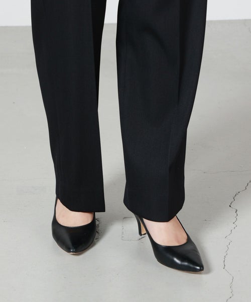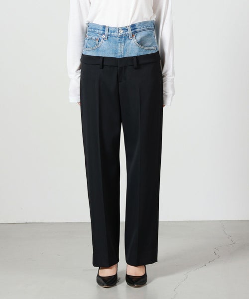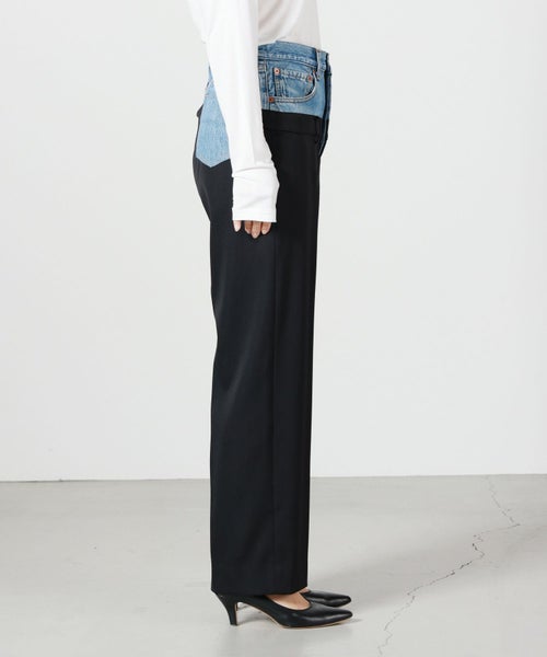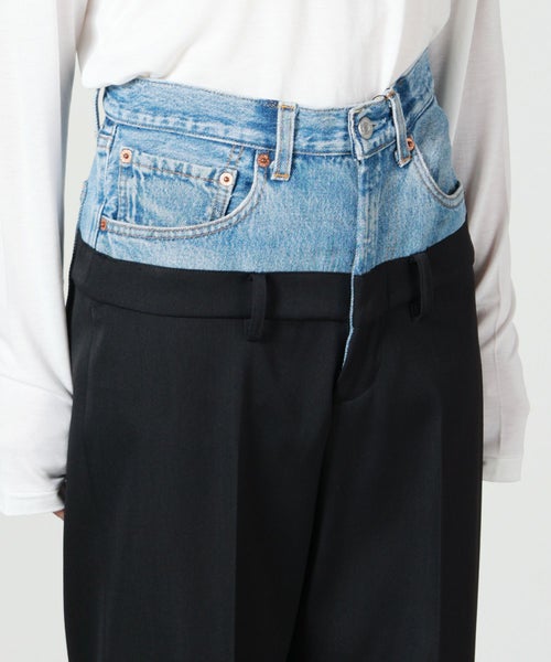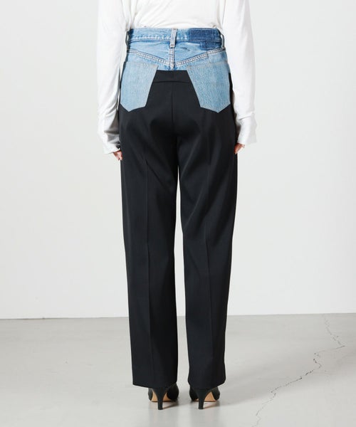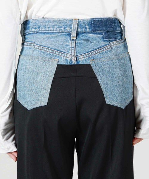 【素材】 スラックス部分は、オリジナルポリエステルブレンド“Bucantini”を採用。高密度に織り上げられた生地は、マットな質感としなやかで張りのある風合いを持ち、構築的なシルエットをしっかり保ちながらも快適な着心地を提供します。また、シワになりにくく、長時間の着用でも美しさをキープする機能性も魅力のひとつです。デニム部分はヴィンテージデニムならではの色合いや風合いが、リメイクならではの味わい深さを引き出します。