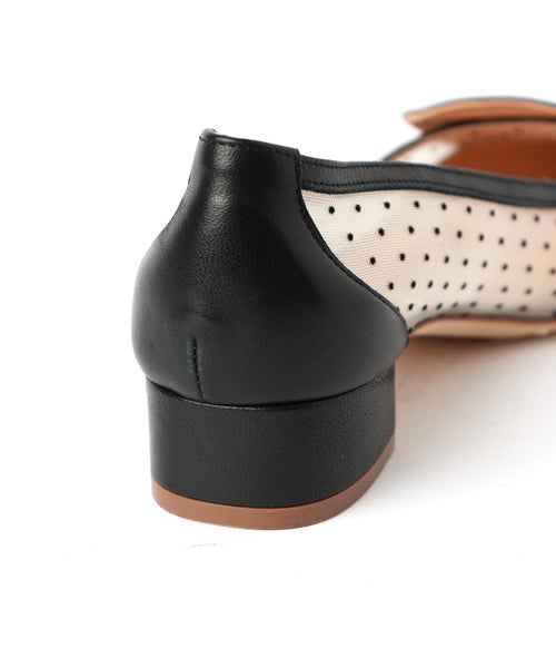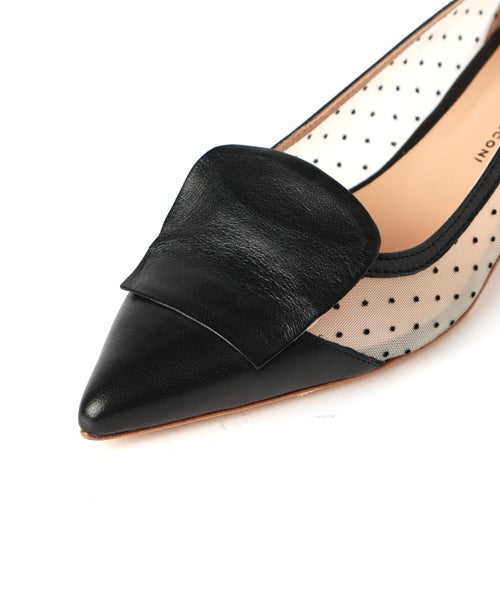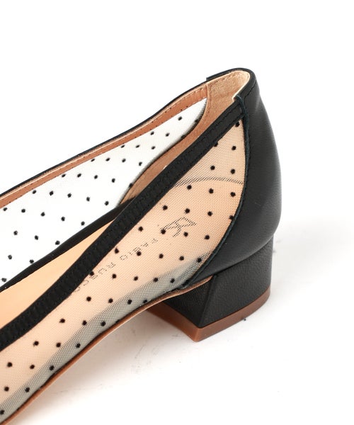 【デザイン】 FABIO RUSCONI(ファビオルスコーニ)のパンプス。サイドにチュール素材をあしらい、さりげない透け感を楽しめるデザイン。軽やかな抜け感が足元をすっきりと見せ、シーズンムードを高めてくれる一足です。チュールにはドット柄を施し、可愛らしさと上品さを両立。甘くなりすぎないバランスで、大人のスタイリングにも取り入れやすい仕上がりです。シャープなポイントテッドトゥが全体を引き締め、女性らしい美しいシルエットを演出。パンツにもスカートにも合わせやすく、コーディネートのアクセントとして活躍します。 軽やかさとエレガントさを兼ね備えた、足元を印象的に彩る一足です。