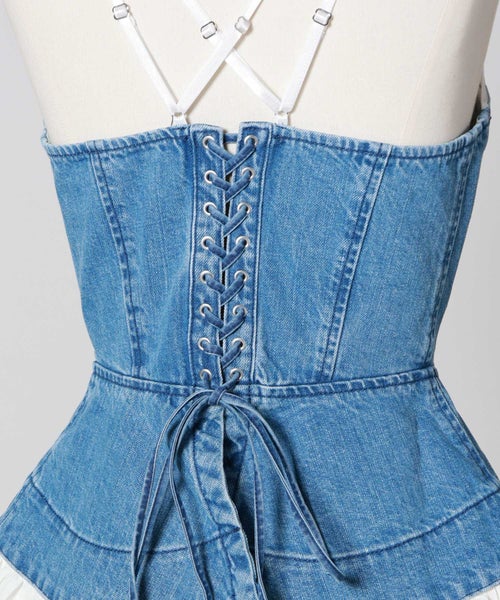 【デザイン】 FETICO(フェティコ)のデニムビスチェトップ。立体感のあるプリーツデザインが目を引くデニムビスチェトップは、構築的なフォルムがウエストラインを美しく引き立て、コンパクトながらも存在感のあるシルエットに仕上げました。フロントに施したプリーツが奥行きと動きを生み、カジュアルなデニム素材にモードなニュアンスをプラス。バックはレースアップ仕様で、体型やスタイリングに合わせてフィット感の調整が可能です。インナー次第でロングシーズン活躍する、着回し力の高い一着です。